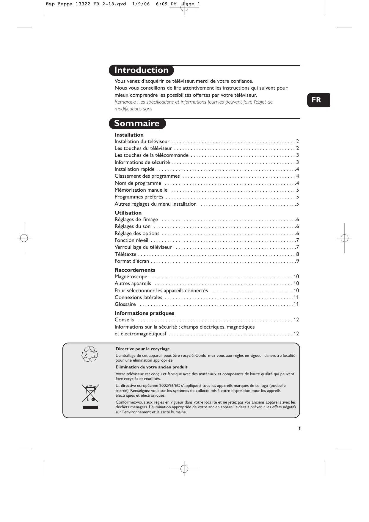 - Informations sur la sécurité : champs électriques, magnétiques et électromagnétiquesf Directive pour le recyclage L’emballage de cet appareil peut être recyclé. Conformez-vous aux règles en vigueur dansvotre localité pour une élimination appropriée. Elimination de votre ancien produit. Votre téléviseur est conçu et fabriqué avec des matériaux et composants de haute qualité qui peuvent être recyclés et réutilisés. La directive européenne 2002/96/EC s’applique à tous les appareils marqués de ce logo (poubelle barrée). Renseignez-vous sur les systèmes de collecte mis à votre disposition pour les appreils électriques et électroniques. Conformez-vous aux règles en vigueur dans votre localité et ne jetez pas vos anciens appareils avec les déchêts ménagers. L’élimination appropriée de votre ancien appareil aidera à prévenir les effets négatifs sur l’environnement et la santé humaine. p. 12