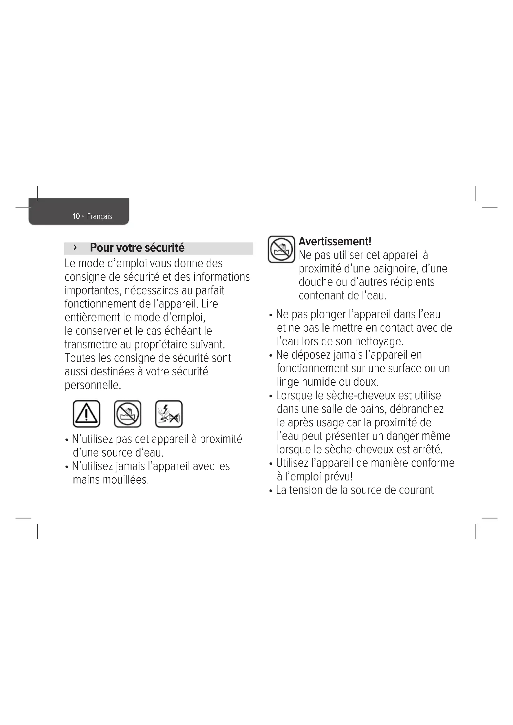 - L'appareil ne doit pas entraire en contact avec des matériaux inflammables. Il ne doit pas non plus etre utilise a proximite de matieres aux inflammables parce que le fer a friser atteignent la tempereut d'env. 200^