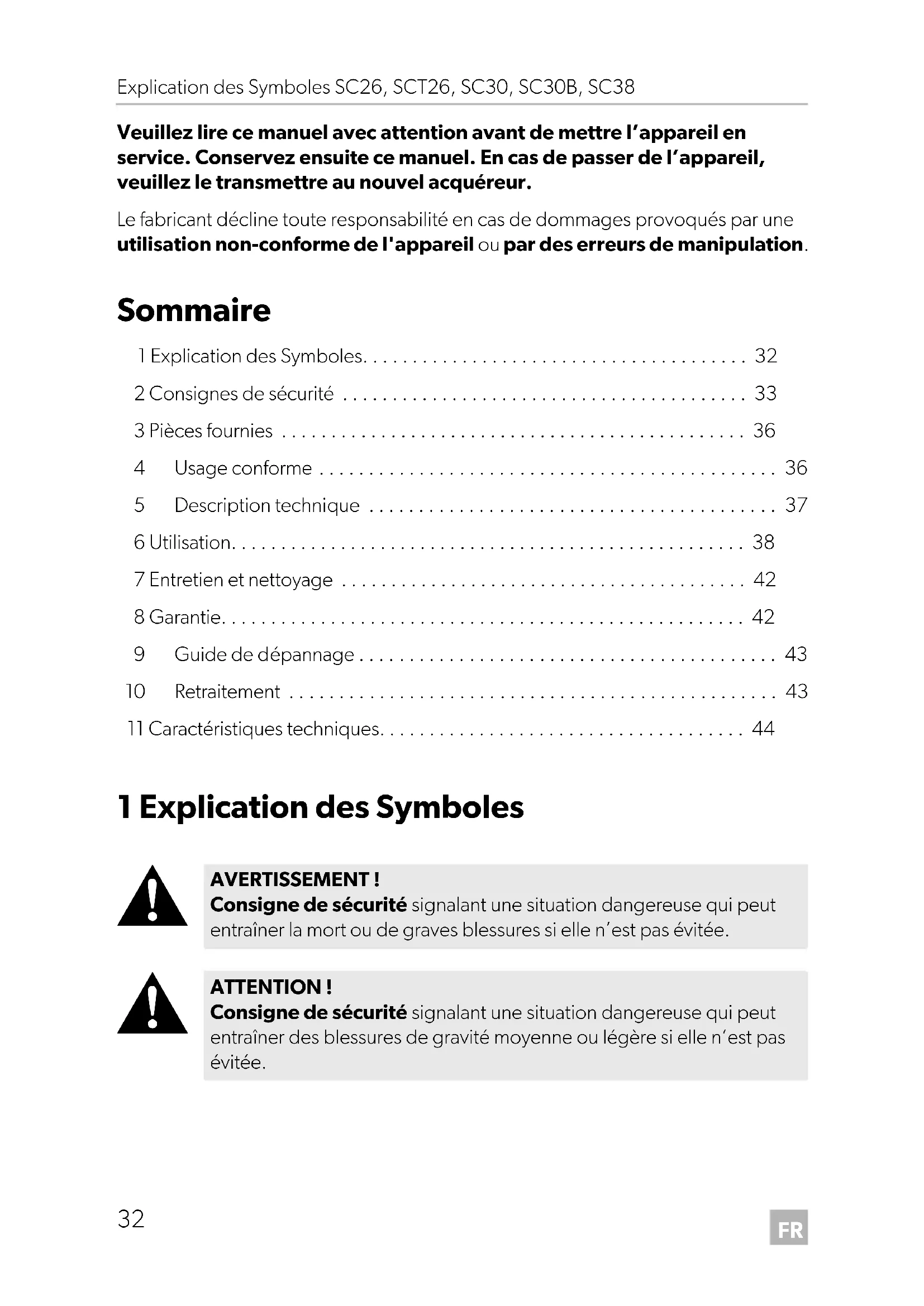 - Veuillez lire ce manuel avec attention avant de mettre l’appareil en service. Conservez ensuite ce manuel. En cas de passer de l’appareil, veuillez le transmettre au nouvel acquéreur. Le fabricant décline toute responsabilité en cas de dommages provoqués par une utilisation non-conforme de l'appareil ou par des erreurs de manipulation. Sommaire 1 Explication des Symboles p. 32