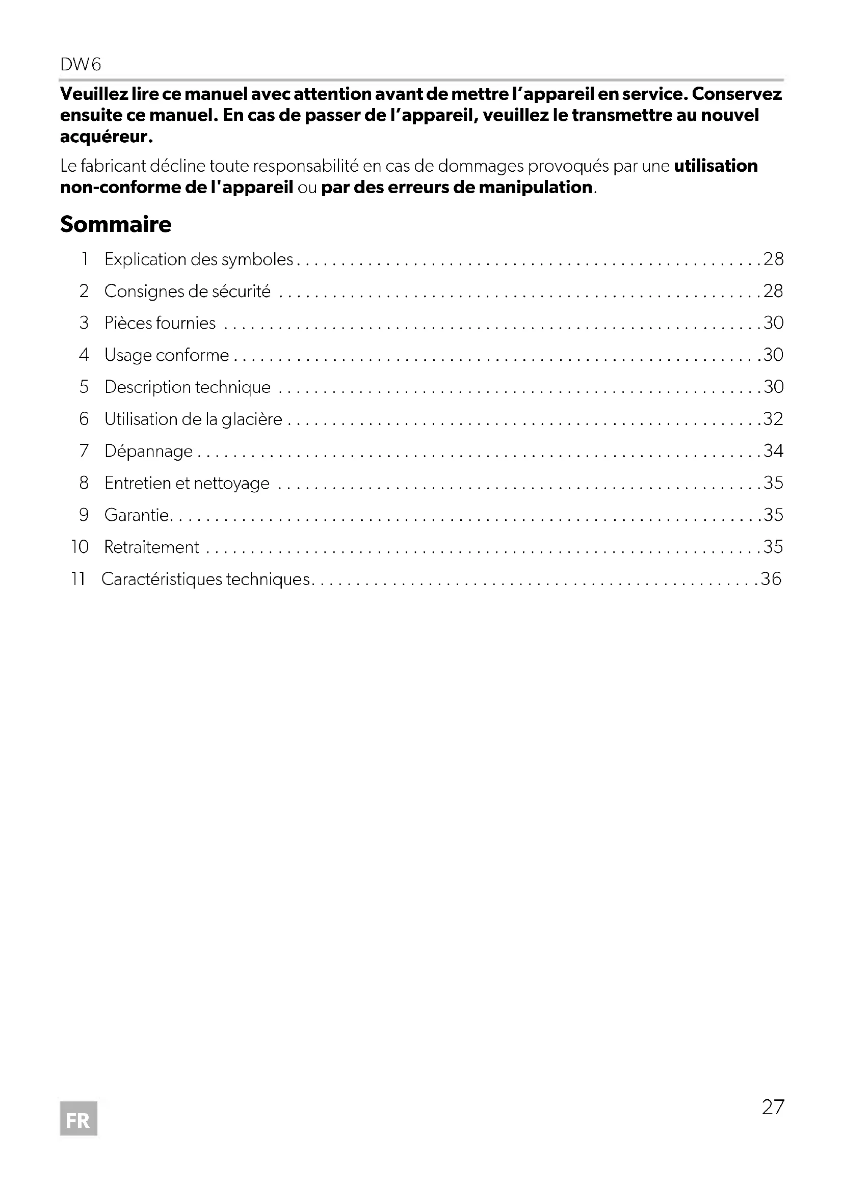 - Veuillez lire ce manuel avec attention avant de mettre l’appareil en service. Conservez ensuite ce manuel. En cas de passer de l’appareil, veuillez le transmettre au nouvel acquéreur. Le fabricant décline toute responsabilité en cas de dommages provoqués par une utilisation non-conforme de l'appareil ou par des erreurs de manipulation. Sommaire 1 Explication des symboles p. 28
