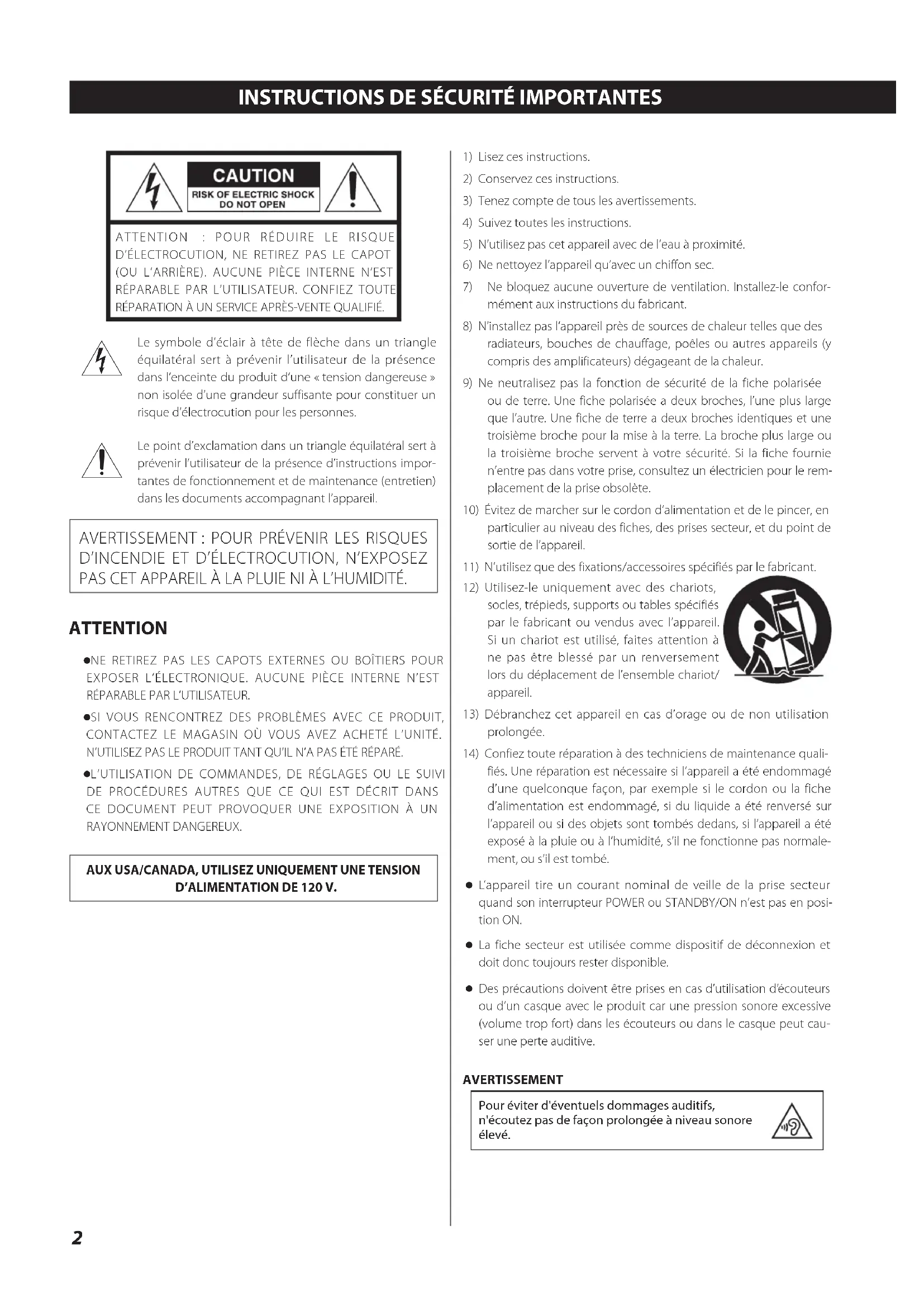 mément aux instructions du fabricant.8) N’installez pas l’appareil près de sources de chaleur telles que des radiateurs, bouches de chauffage, poêles ou autres appareils (y compris des amplificateurs) dégageant de la chaleur.9) Ne neutralisez pas la fonction de sécurité de la fiche polarisée ou de terre. Une fiche polarisée a deux broches, l’une plus large que l’autre. Une fiche de terre a deux broches identiques et une troisième broche pour la mise à la terre. La broche plus large ou la troisième broche servent à votre sécurité. Si la fiche fournie n’entre pas dans votre prise, consultez un électricien pour le rem-placement de la prise obsolète.10) Évitez de marcher sur le cordon d’alimentation et de le pincer, en particulier au niveau des fiches, des prises secteur, et du point de sortie de l’appareil.11) N’utilisez que des fixations/accessoires spécifiés par le fabricant.12) Utilisez-le uniquement avec des chariots, socles, trépieds, supports ou tables spécifiés par le fabricant ou vendus avec l’appareil. Si un chariot est utilisé, faites attention à ne pas être blessé par un renversement lors du déplacement de l’ensemble chariot/appareil.13) Débranchez cet appareil en cas d’orage ou de non utilisation prolongée.14) Confiez toute réparation à des techniciens de maintenance quali-fiés. Une réparation est nécessaire si l’appareil a été endommagé d’une quelconque façon, par exemple si le cordon ou la fiche d’alimentation est endommagé, si du liquide a été renversé sur l’appareil ou si des objets sont tombés dedans, si l’appareil a été exposé à la pluie ou à l’humidité, s’il ne fonctionne pas normale-ment, ou s’il est tombé. o L’appareil tire un courant nominal de veille de la prise secteur quand son interrupteur POWER ou STANDBY/ON n’est pas en posi-tion ON. o La fiche secteur est utilisée comme dispositif de déconnexion et doit donc toujours rester disponible. o Des précautions doivent être prises en cas d’utilisation d’écouteurs ou d’un casque avec le produit car une pression sonore excessive (volume trop fort) dans les écouteurs ou dans le casque peut cau-ser une perte auditive.AVERTISSEMENTPour éviter d'éventuels dommages auditifs, n'écoutez pas de façon prolongée à niveau sonore élevé.