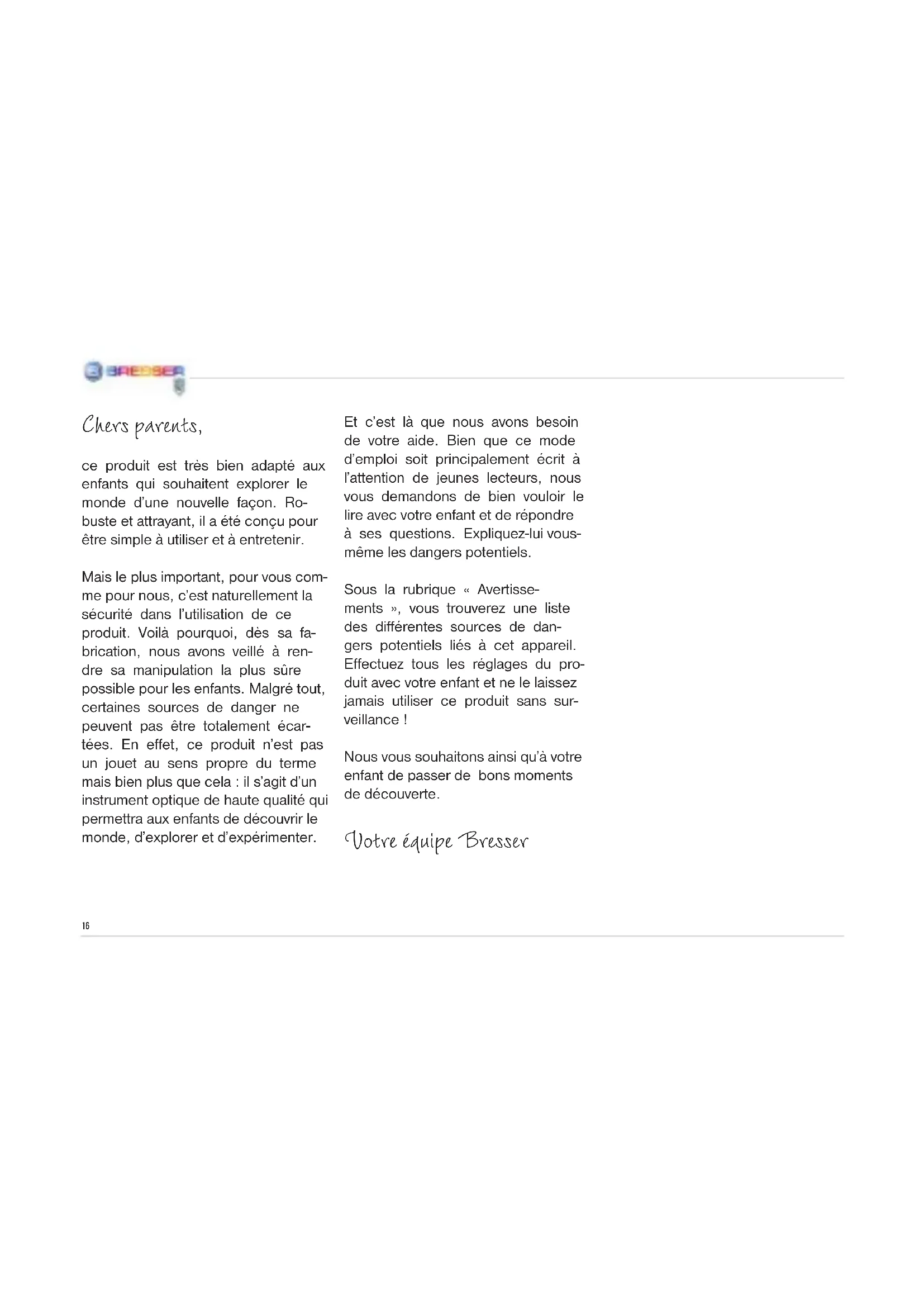Tenez l’appareil à l’abri de la pous- sière et de l’humidité ! Conservez-le dans la sacoche incluse à la livraison ou bien dans l’emballage de trans- port. Retirez les piles de l‘appareil si vous ne n’utilisez pas pendant un certain temps ! Pour nettoyer les lentilles (oculaires et /ou objectifs), utilisez uniquement le chiffon à lentilles ci-joint ou bien un chiffon doux et non pelucheux (par exemple en microbre). N’appuyez pas trop fortement le chiffon sur les lentilles pour ne pas les rayer. Pour retirer des traces de saleté plus résistantes, humidiez légèrement le chiffon avec un liquide prévu pour le nettoyage des lunettes et passez sur les lentilles en exerçant une légère pression. ÉLIMINATION Éliminez les matériaux d’embal- lage selon le type de produit. Certicat de conformité UE La société Meade Instru- ments Europe Gmbh & Co. KG, domiciliée à 46414 Rhede/ Westf., Gutenbergstr. 2, Allemagne, certie la conformité de ce produit avec les directives de l‘UE ci-après: EN 61010-1:2001 Description du produit: StereoMicro Type / Désignation: Microscope STX Rhede, 05-05-2009 Meade Instruments Europe GmbH & Co. KG Helmut Ebbert Gérant Pour plus d’informations concernant l’élimination conforme, contactez le prestataire communal d’élimination des déchets ou bien l’ofce de l’envi- ronnement. Ne jetez pas d’appareils électri- ques dans les ordures ménagè- res ! Selon la directive européenne 2002/96/EG relative aux déchets d‘équipements électriques et électro- niques et à sa mise en œuvre au ni- veau du droit national, les équipements électriques doivent être triés et dépo- sés à un endroit où ils seront recyclés de façon écologique. Les piles et les accumulateurs usagés doivent être déposés dans des conte- neurs de collectes de piles prévus à cet effet. Pour plus d’informations concer- nant l’élimination conforme d’appareils usagés et de piles usagées produites après le 01.06.2006, contactez le prestataire d’élimination communal ou bien l’ofce de l’environnement.20 Ton microscope est composé des pièces suivantes (Fig. 1–4): 1 Vue binoculaire (avec tubes oculaires) 2 Objectif stéréo 3 Oculaires 4 Eclairage (LED) 5 Table de microscope (avec plaque pour objets) 6 Pince pour objet 7 Roue de focalisation 8 Interrupteur marche/arrêt 9 Compartiment à piles 10 Fermoir du compartiment à piles 11 Couvercle du compartiment à piles 12 Contacts des piles (tôles plates et bornes à ressort) 13 Cache de lumière diffuse Lieu Avant de commencer, trouve un en- droit spécique pour installer le mi- croscope. Il est important que tu aies sufsamment de lumière à ta disposi- tion (fenêtre, lampe de table). Observation simple Place l’objet à observer (par exem- ple, une pierre) au milieu de la table du microscope. Quand l’objet est sufsamment gros, tu peux mieux le caler sous la pince à objet (6). Regarde maintenant à travers la vue binoculaire (1) et modie la distance des oculaires de sorte à obtenir une image ronde et claire. La précision de l’image se règle en tournant lentement la roue de focali- sation (7). Eclairage Retire les deux oculaires (3) des tu- bes oculaires (1) et retourne complè- tement le microscope. Au pied du mi- croscope se trouve le compartiment à piles (9). Appuie sur le fermoir (10) et ouvre le compartiment à piles en soulevant le couvercle (11) en biais (tout en appuyant sur le fermoir). Place les batteries dans les compar- timents de sorte que le pôle moins (-) plat des piles s‘appuient contre les bornes à ressorts et que le pôle plus (+) des piles touchent ensuite les contacts-tôles plates (12). Ferme le compartiment à piles avec le couvercle (11) et retourne le microscope. Réinstalle les ocu- laires. Avec l’interrupteur marche/ arrêt (8) au pied du microscope, tu peux maintenant allumer ou éteindre l‘éclairage (4).21 FR22 Beste ouders, Dit product is ideaal voor kinderen die hun wereld op een nieuwe ma- nier willen ontdekken. Daarom is hij gemakkelijk te bedienen en te on- derhouden; hij is robuust en ziet er goed uit. Belangrijker dan dat alles is voor u en voor ons uiteraard het veilige gebruik ervan. Zo hebben wij er al bij de fabri- cage aan gedacht om dit product ook voor gebruik door kinderen zo veilig mogelijk te maken. Desondanks kun- nen bepaalde gevaren nooit geheel worden uitgesloten. Tenslotte gaat het hierbij niet om een stuk speel- goed in de oorspronkelijke beteke- nis, maar om veel meer. Dit product is een volwaardig optisch instrument, waarmee kinderen de wereld kunnen beleven, onderzoeken en experi- menteren. Daarom vragen wij hierbij uw mede- werking. Deze gebruiksaanwijzing is op wezenlijke punten weliswaar voor kinderen geschreven, maar leest u ze desondanks toch samen met uw kind door en beantwoordt u zijn vra- gen. Leg zelf de mogelijke gevaren aan uw kind uit. In de rubriek “Waarschuwingen“ wor- den mogelijke gevaren benoemd die kunnen optreden bij het gebruik van dit apparaat. Neem alle instellingen op het apparaat samen met uw kind door, en verlies uw kind daarbij niet uit het oog! Wij wensen u en uw kind veel plezier en spannende ontdekkingen toe. Uw Bresser team23