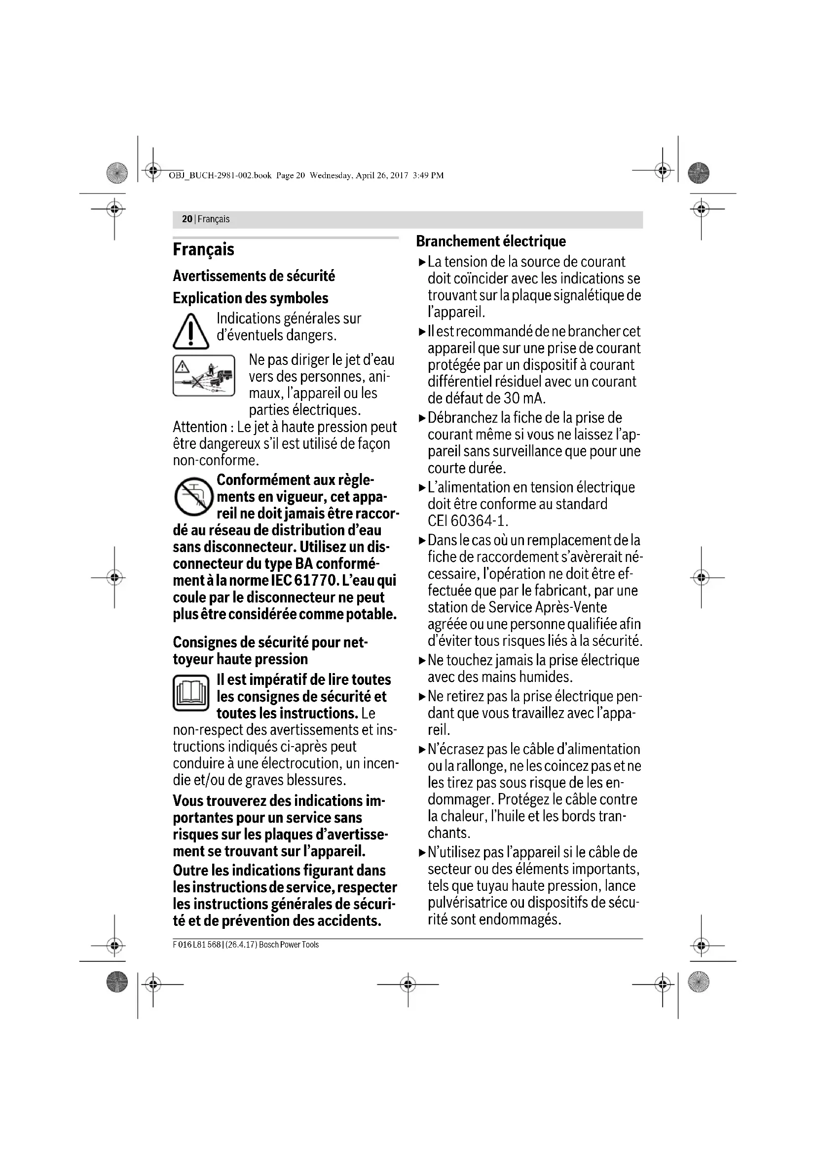 pour un câble de rallonge d’une longueur max. de 20 m Les connexions de câble (fiche et prises de courant) doivent être sèches et ne pas reposer sur le sol. Dans ce cas, nous recommandons d’utiliser un dévidoir dont la prise est 60 mm min. au-dessus du sol. Remarque : Au cas où une rallonge devrait être utilisée, celle- ci doit disposer, conformément à la description figurant dans les instructions de sécurité, d’un câble de protection de terre raccordé à la terre de l’installation électrique par l’intermé- diaire de la fiche. Respecter les instructions d’utilisation du fabricant du câble de rallonge ou du dévidoir ainsi que les règlementations natio- nales spécifiques à leur utilisation. En cas de doute, consultez un électricien de formation ou le Service Après-Vente Bosch le plus proche. Remarque concernant les produits non commercialisés en GB : ATTENTION : Pour votre propre sécurité, il est nécessaire que la fiche montée sur l’outil de jardin soit raccordée à la ral- longe. Le dispositif de couplage de la rallonge doit être proté- gé des projections d’eau, être en caoutchouc ou être recou- vert de caoutchouc. La rallonge doit être utilisée avec un serre-câble. Fonctionnement Mise en marche Raccorder le tuyau d’eau (non fourni) sur le raccord de robi- net et l’appareil. Veillez à ce que l’interrupteur se trouve dans la position « 0 » et branchez l’appareil sur la prise. Ouvrez le robinet. Actionnez le verrouillage de mise en fonctionnement (inter- rupteur arrière sur la poignée de la lance) pour débloquer la gâchette. Appuyez à fond sur la gâchette jusqu’à ce que l’eau coule de manière régulière et qu’il n’y ait plus d’air dans l’ap- pareil et dans le tuyau haute pression. Lâchez la gâchette. Ac- tionnez le verrouillage de mise en fonctionnement (interrup- teur avant sur la poignée de la lance). Tournez l’interrupteur principal. Dirigez la lance pulvérisatrice vers le bas. Actionnez le verrouillage de mise en fonctionnement afin de déverrouiller la gâchette. Appuyez à fond sur la gâchette. Fonction autostop (arrêt automatique) L’appareil arrête le moteur dès que la gâchette sur la poignée de la lance est relâchée. Instructions d’utilisation Généralités Assurez-vous que le nettoyeur haute pression se trouve sur une surface plane. Ne vous éloignez pas trop avec le tuyau flexible haute pression et ne tirez pas le nettoyeur haute pression par le tuyau. Cela pourrait faire perdre l’équilibre au nettoyeur haute pression qui risque de basculer. Ne pliez pas le tuyau flexible haute pression et ne passez pas dessus avec un véhicule. Protégez le tuyau flexible haute pression de bords et de coins tranchants. Ne jamais utiliser la buse à jet rotatif ou le faisceau point pour nettoyer des voitures. Nettoyer la buse