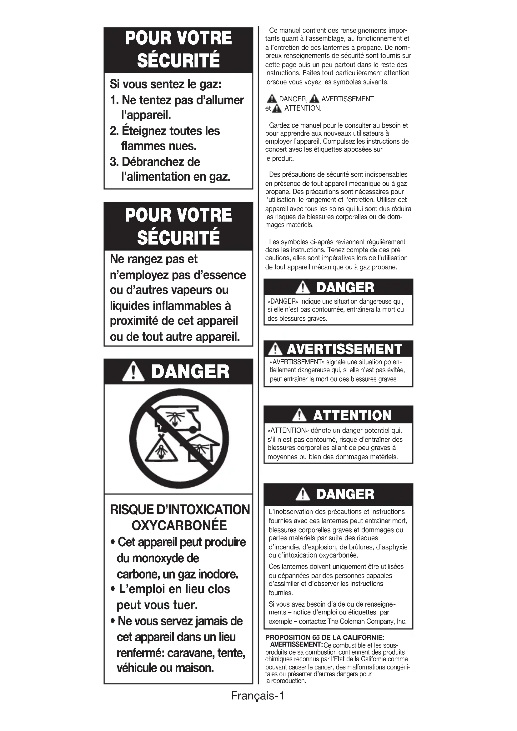 - Ne vous servez jamais de cet appareil dans un lieu renfermé: caravane, tente, véhicule ou maison. DANGER Ce manuel contient des renseignements impor-tants quant à l’assemblage, au fonctionnement et à l’entretien de ces lanternes à propane. De nom-breux renseignements de sécurité sont fournis sur cette page puis un peu partout dans le reste des instructions. Faites tout particulièrement attention lorsque vous voyez les symboles suivants: DANGER, AVERTISSEMENT et ATTENTION. Gardez ce manuel pour le consulter au besoin et pour apprendre aux nouveaux utilisateurs à employer l’appareil. Compulsez les instructions de concert avec les étiquettes apposées sur le produit. Des précautions de sécurité sont indispensables en présence de tout appareil mécanique ou à gaz propane. Des précautions sont nécessaires pour l’utilisation, le rangement et l’entretien. Utiliser cet appareil avec tous les soins qui lui sont dus réduira les risques de blessures corporelles ou de dom mages matériels. Les symboles ci-après reviennent régulièrement dans les instructions. Tenez compte de ces pré cautions, elles sont impératives lors de l’utilisation de tout appareil mécanique ou à gaz propane. DANGER «DANGER» indique une situation dangereuse qui, si elle n’est pas contournée, entraînera la mort ou des blessures graves. ATTENTION «ATTENTION» dénote un danger potentiel qui, s’il n’est pas contourné, risque d’entraîner des blessures corporelles allant de peu graves à moyennes ou bien des dommages matériels.PROPOSITION 65 DE LA CALIFORNIE: AVERTISSEMENT: Ce combustible et les sous- produits de sa combustion contiennent des produits chimiques reconnus par l’État de la Californie comme pouvant causer le cancer, des malformations congéni-tales ou présenter d’autres dangers pour la reproduction.L’inobservation des précautions et instructions fournies avec ces lanternes peut entraîner mort, blessures corporelles graves et dommages ou pertes matériels par suite des risques d’incendie, d’explosion, de brûlures, d’asphyxie ou d’intoxication oxycarbonée. Ces lanternes doivent uniquement être utilisées ou dépannées par des personnes capables d’assimiler et d’observer les instructions fournies.Si vous avez besoin d’aide ou de renseigne ments – notice d’emploi ou étiquettes, par exemple – contactez The Coleman Company, Inc. DANGER «AVERTISSEMENT» signale une situation poten-tiellement dangereuse qui, si elle n’est pas évitée, peut entraîner la mort ou des blessures graves. AVERTISSEMENTFrançais-2 AVERTISSEMENT
