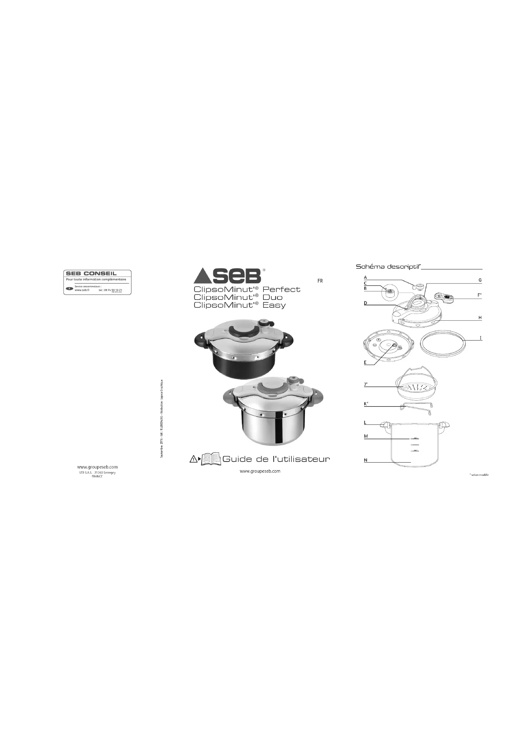- selon modèle SE_CLIPSO-MINUT_1520004385.qxp_Mise en page 1 26/09/2016 15:57 Page1516 *selon modèle Pour nettoyer le minuteur* (F) : Utilisez un chiffon propre et sec. N’utilisez pas de solvant. Ne passez jamais le minuteur sous l’eau ou au lave-vaisselle. Pour changer le joint de votre autocuiseur : Changez le joint de votre autocuiseur tous les ans ou si celui-ci présente une coupure. Prenez toujours un joint d’origine SEB, correspondant à votre modèle (voir paragraphe "Accessoires"). Pour la remise en place du joint, veuillez vous reporter - fig 15 et veillez à ce que le joint soit bien passé sous chacune des encoches du couvercle. Pour ranger votre autocuiseur : Retournez le couvercle sur la cuve. Le mécanisme d’ouverture/fermeture de l’autocuiseur ne nécessite pas d’entretien particulier hormis le nettoyage. Accessoires SEB Les accessoires de votre autocuiseur disponibles dans le commerce sont : Pour le changement d’autres pièces ou réparations, faites appel aux Centres de Service Agréés SEB. N’utilisez que des pièces d’origine SEB correspondant à votre modèle. Entretien Il est impératif de faire vérifier votre autocuiseur dans un Centre de Service Agréé SEB après 10 ans d'utilisation. Accessoires Références Joint 3/4/4.5/6 L : diamètre extérieur du joint : 24 cm X1010008 5/7.5/9 L : diamètre extérieur du joint : 27 cm X1010007 Panier vapeur* 3/4.5/4/6 L : pour cuve diamètre 22 cm 7921855/7.5/9 L : pour cuve diamètre 24 cm 792654 Trépied* Minuteur* X1060007 SE_CLIPSO-MINUT_1520004385.qxp_Mise en page 1 26/09/2016 15:57 Page16Diamètre du fond de votre autocuiseur - références Informations normatives : Pression supérieure de fonctionnement : 65 kPa Pression maximum de sécurité : 120 kPa Sources de chaleur compatibles Votre autocuiseur s’utilise sur tous les modes de chauffage, y compris induction. Sur plaque électrique, employez une plaque de diamètre égal ou inférieur à celui du fond de votre autocuiseur. Sur table vitrocéramique, assurez-vous que le fond de la cuve est propre et net. Sur gaz, la flamme ne doit pas déborder du diamètre de la cuve. Sur tous les foyers, veillez à ce que votre autocuiseur soit bien centré. Dans le cadre de l’utilisation préconisée par le mode d’emploi, la cuve inox de votre nouvel autocuiseur SEB est garantie 10 ans contre : - Tout défaut lié à la structure métallique de votre cuve, - Toute dégradation prématurée du métal de base. Caractéristiques Capacité Ø Cuve