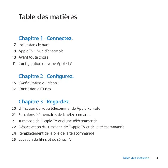 | Configuration de votre Apple TV | « Configuration de votre Apple TV » à la page 11 |