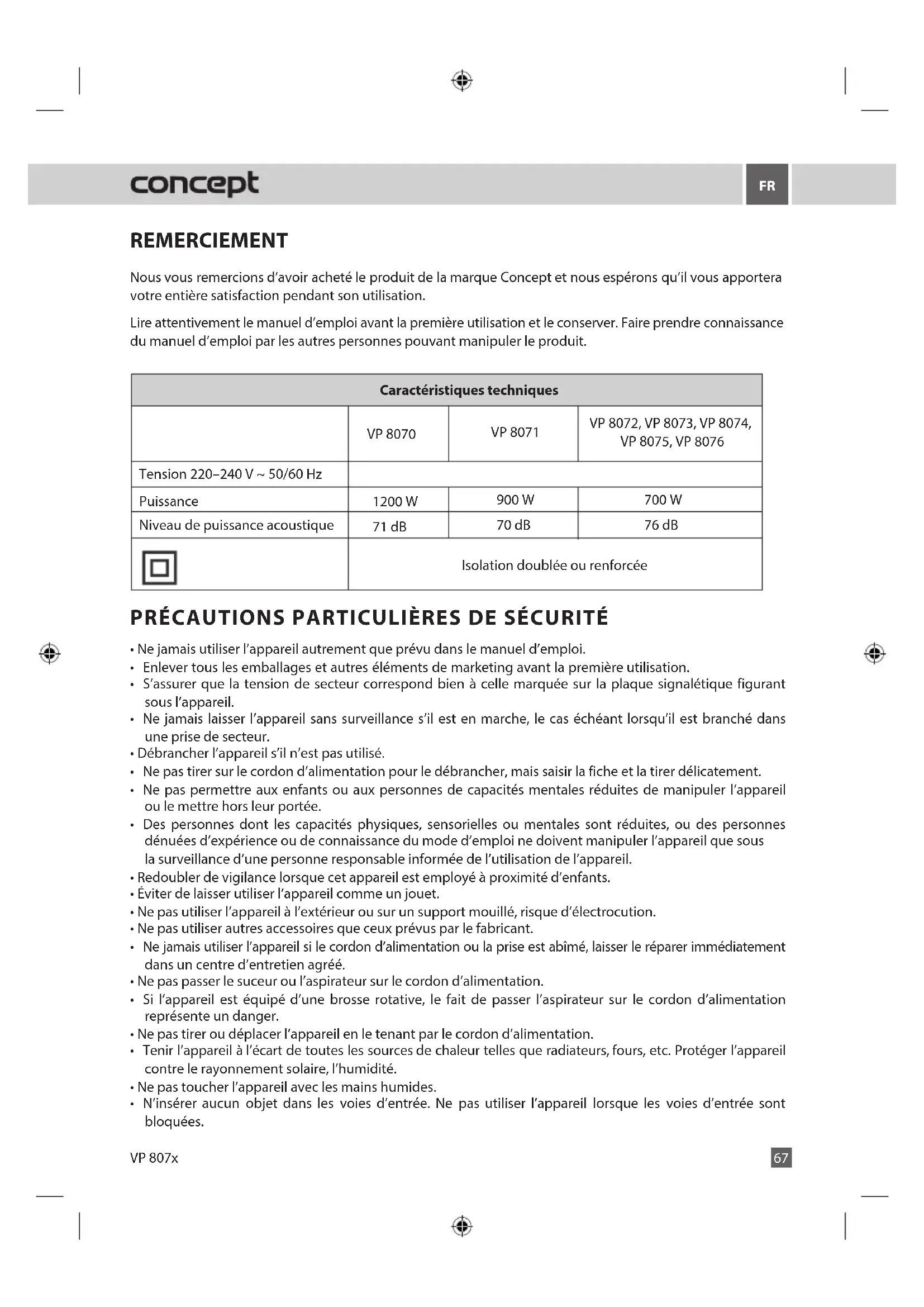 REMERCIEMENT Nous vous remercions d’avoir acheté le produit de la marque Concept et nous espérons qu’il vous apportera votre entière satisfaction pendant son utilisation. Lire attentivement le manuel d’emploi avant la première utilisation et le conserver. Faire prendre connaissance du manuel d’emploi par les autres personnes pouvant manipuler le produit. PRÉCAUTIONS PARTICULIÈRES DE SÉCURITÉ