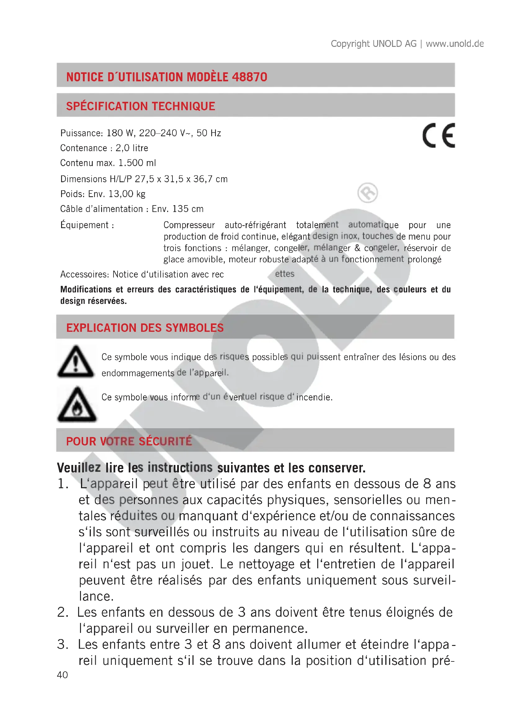 Ce symbole vous indique des risques possibles qui puissent entraîner des lésions ou des endommagements de l’appareil. Ce symbole vous informe d‘un éventuel risque d‘incendie. Copyright UNOLD AG | www.unold.de41 vue normalement, qu‘ils sont surveillés ou qu‘ils ont été instruits au niveau de l‘utilisation sûre et ont compris les dangers qui en résultent. Il est interdit aux enfants entre 3 et 8 ans de raccorder l‘appareil, de le commander, de le nettoyer ou de l‘entretenir.