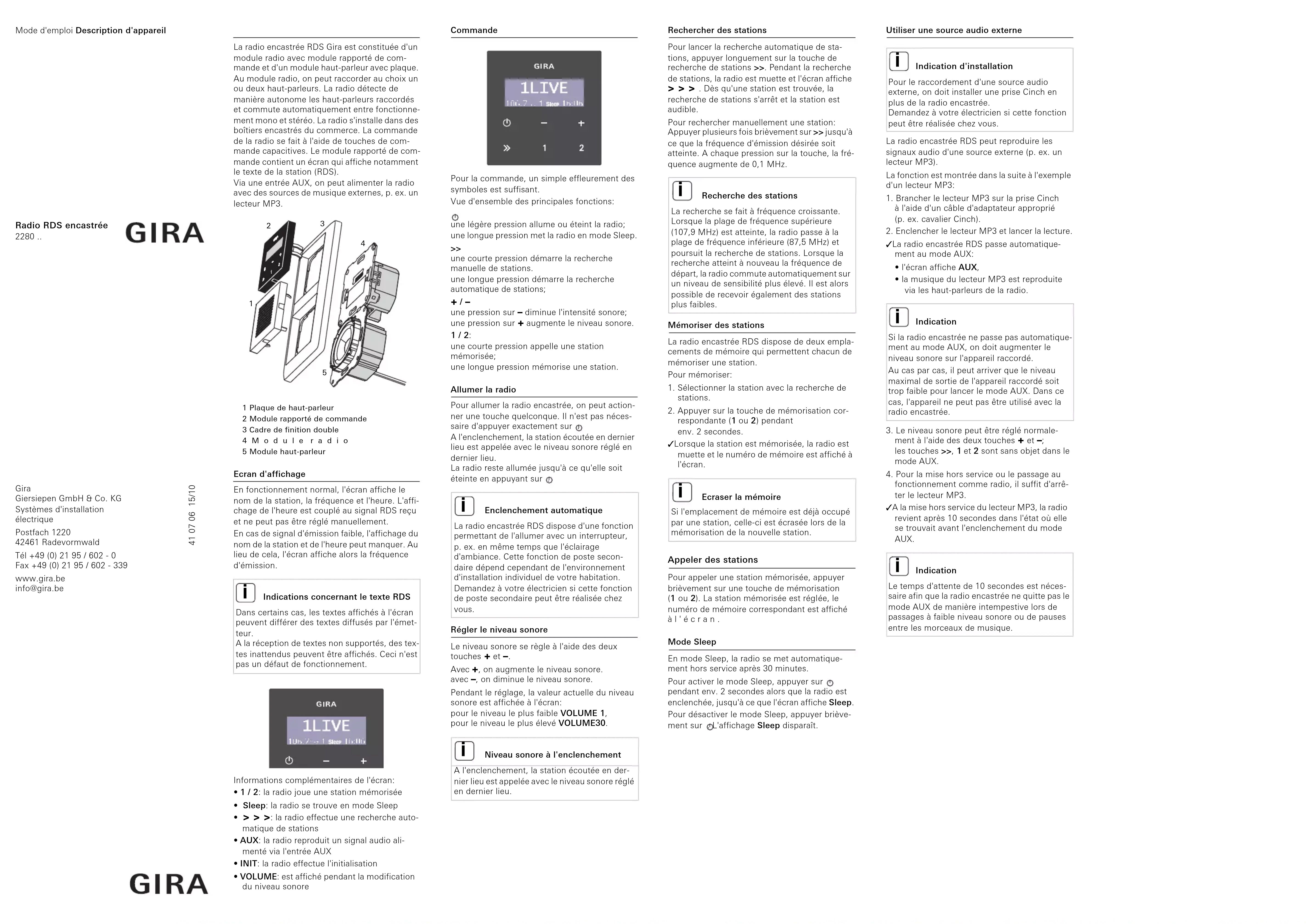 A radio encastree RDS Gira est constituée d'un module radio avec module rapporté de commande et d'un module haut-parlier avec plaque. Une module radio, qui on peut raccorder au besoin ou deux haut-parlieurs. La radio détecte de la commande, qui est générale dans le commode, s'est commodeaument entière fonctionnel mono et stéroide. La radio s'installée dans des politeurs encastrees du commerce. La commande à la radio se fait à l'aide de touches de commande capacités. Le module rapporté de commande content un écran qui affiche notamment la commande d'attribution (RDS). Le module rapporté de commande a une entente AUX, qu'on peut allément la radio avec des sources de musique externes, p. ex. un lecteur PM3.