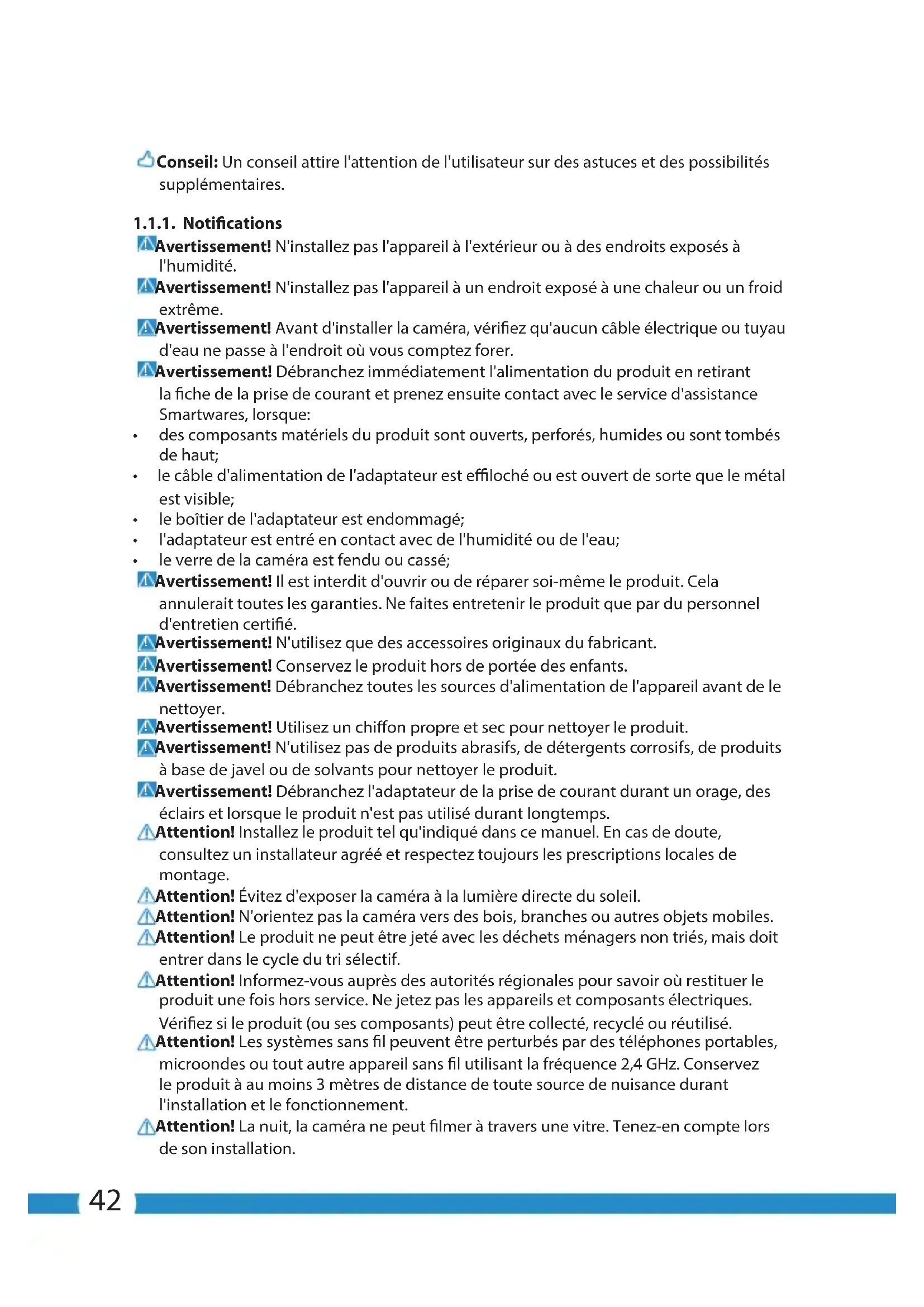Avertissement! Débranchez l'adaptateur de la prise de courant durant un orage, des éclairs et lorsque le produit n'est pas utilisé durant longtemps. Attention! Installez le produit tel qu'indiqué dans ce manuel. En cas de doute, consultez un installateur agréé et respectez toujours les prescriptions locales de montage. Attention! Évitez d'exposer la caméra à la lumière directe du soleil. Attention! N'orientez pas la caméra vers des bois, branches ou autres objets mobiles. Attention! Le produit ne peut être jeté avec les déchets ménagers non triés, mais doit entrer dans le cycle du tri sélectif. Attention! Informez-vous auprès des autorités régionales pour savoir où restituer le produit une fois hors service. Ne jetez pas les appareils et composants électriques. Vériez si le produit (ou ses composants) peut être collecté, recyclé ou réutilisé. Attention! Les systèmes sans l peuvent être perturbés par des téléphones portables, microondes ou tout autre appareil sans l utilisant la fréquence 2,4 GHz. Conservez le produit à au moins 3 mètres de distance de toute source de nuisance durant l'installation et le fonctionnement. Attention! La nuit, la caméra ne peut lmer à travers une vitre. Tenez-en compte lors de son installation.43
