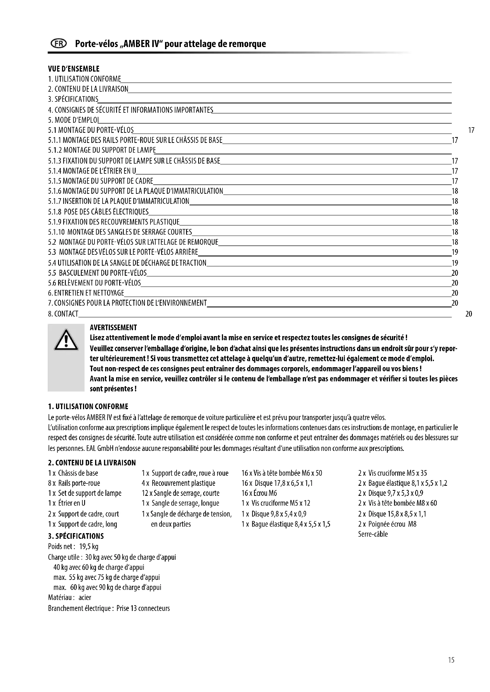 Le porte-vélos AMBER IV est xé à l‘attelage de remorque de voiture particulière et est prévu pour transporter jusqu‘à quatre vélos. L‘utilisation conforme aux prescriptions implique également le respect de toutes les informations contenues dans ces instructions de montage, en particulier le respect des consignes de sécurité. Toute autre utilisation est considérée comme non conforme et peut entraîner des dommages matériels ou des blessures sur les personnes. EAL GmbH n‘endosse aucune responsabilité pour les dommages résultant d‘une utilisation non conforme aux prescriptions.