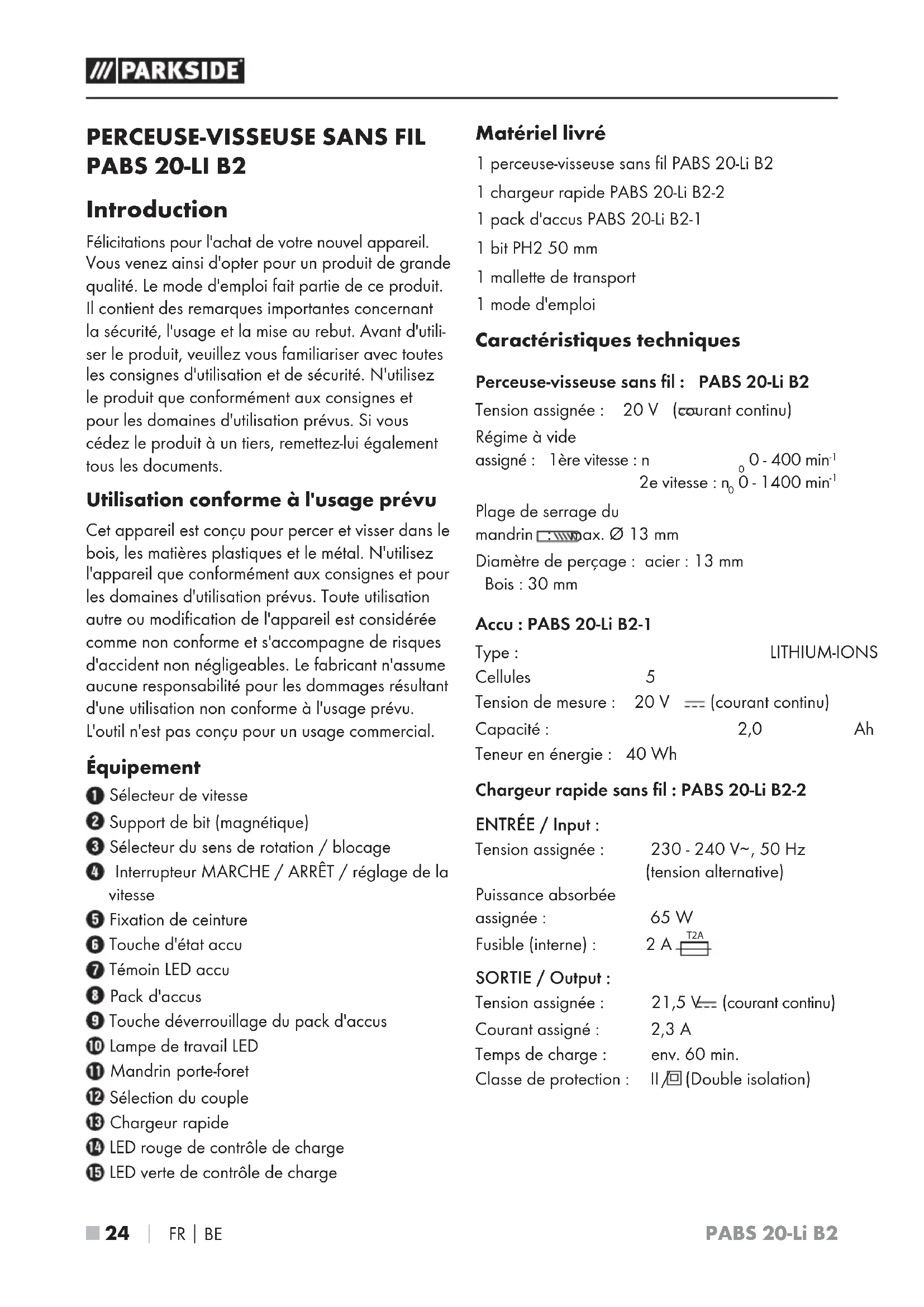 PABS 20Li B2 - Perceuse PARKSIDE - Notice d'utilisation et mode d'emploi gratuit