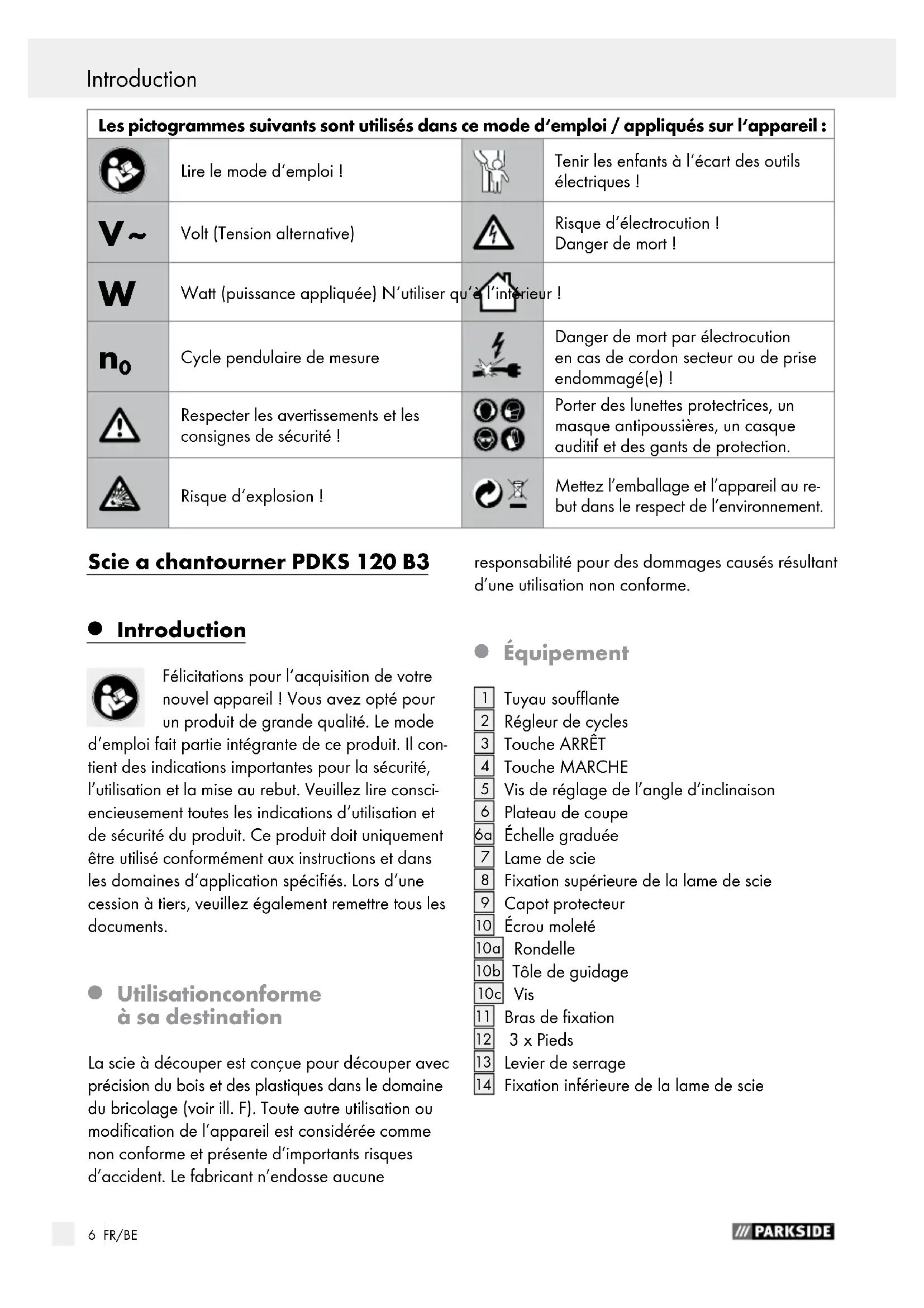 125 FR/BE Introduction Utilisation conforme à sa destination ................................................................................................. Page 6 Équipement .......................................................................................................................................... Page 6 Fourniture ............................................................................................................................................. Page 7 Caractéristiques...................................................................................................................................Page 7 Instructions de sécurité générales Travailler en toute sécurité ..................................................................................................................Page 7 Consignes de sécurité spécifiques pour les scies à découper .........................................................Page 9 Instructions de travail ..........................................................................................................................Page 9 Montage Monter le capot protecteur (voir ill. A) .............................................................................................. Page 9 Monter les pieds (voir ill. B) ...............................................................................................................Page 10 Monter le tuyau de soufflante (voir ill. C) ..........................................................................................Page 10 Mise en service Réglage du cycle pendulaire .............................................................................................................Page 10 Basculer le plateau de coupe (voir ill. D, E) ...................................................................................... Page 10 Monter / démonter la lame de scie ....................................................................................................Page 10 Entretien et nettoyage Entretien ...............................................................................................................................................Page 11 Nettoyage ...........................................................................................................................................Page 11 Service ...............................................................................................................................................Page 11 Garantie ........................................................................................................................................... Page 11 Mise au rebut ............................................................................................................................... Page 12 Déclaration de conformité / Fabricant ....................................................................Page 12 Table des matières6 FR/BE Introduction / Instructions de sécurité généralesIntroduction Scie a chantourner PDKS 120 B3 Introduction Félicitations pour l‘acquisition de votre nouvel appareil ! Vous avez opté pour un produit de grande qualité. Le mode d‘emploi fait partie intégrante de ce produit. Il con-tient des indications importantes pour la sécurité, l’utilisation et la mise au rebut. Veuillez lire consci-encieusement toutes les indications d‘utilisation et de sécurité du produit. Ce produit doit uniquement être utilisé conformément aux instructions et dans les domaines d‘application spécifiés. Lors d‘une cession à tiers, veuillez également remettre tous les documents.Q Utilisation conforme à sa destination La scie à découper est conçue pour découper avec précision du bois et des plastiques dans le domaine du bricolage (voir ill. F). Toute autre utilisation ou modification de l’appareil est considérée comme non conforme et présente d’importants risques d’accident. Le fabricant n’endosse aucune responsabilité pour des dommages causés résultant d’une utilisation non conforme.