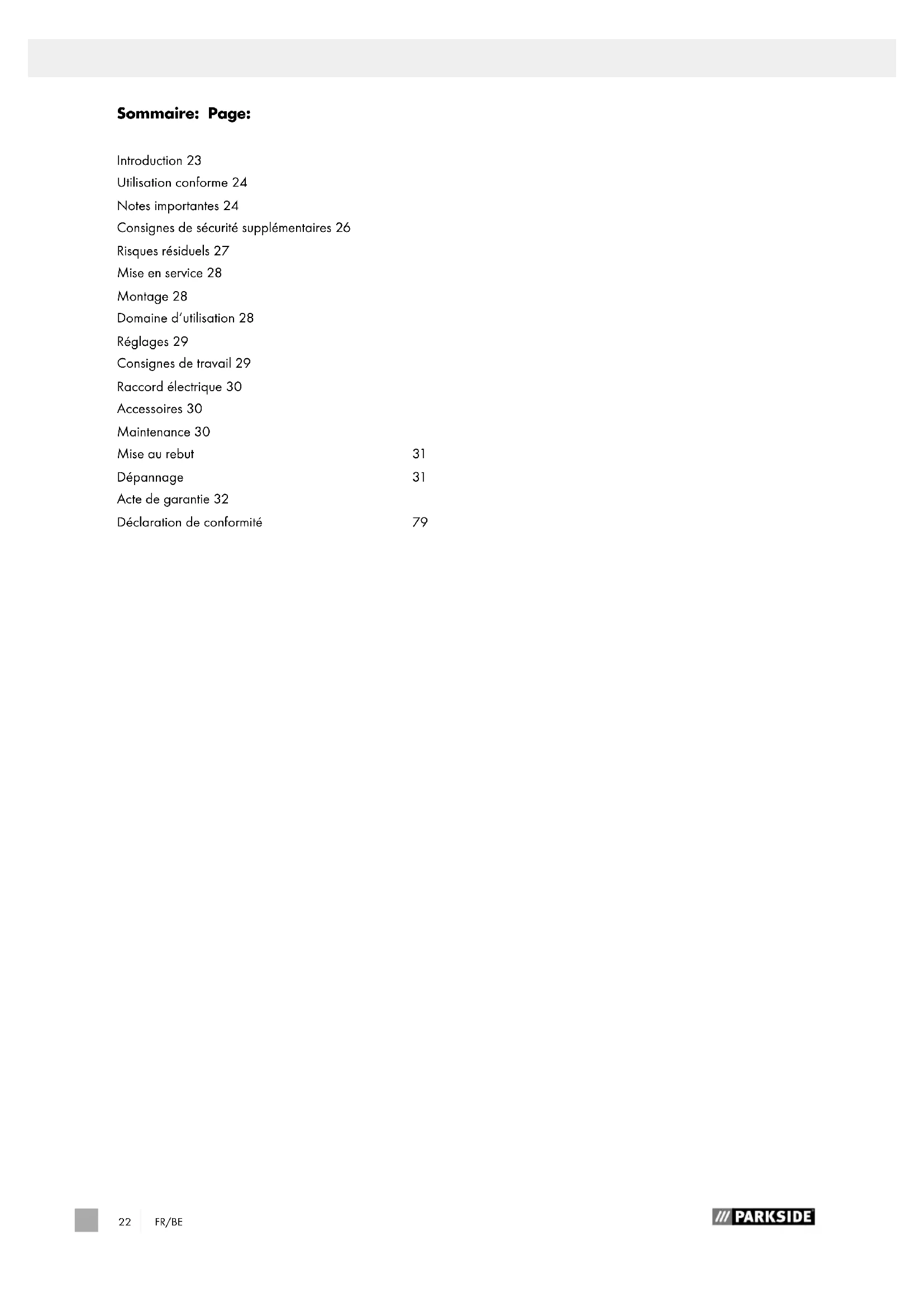 Sommaire: Page: Introduction 23 Utilisation conforme 24 Notes importantes 24 Consignes de sécurité supplémentaires 26 Risques résiduels 27 Mise en service 28 Montage 28 Domaine d‘utilisation 28 Réglages 29 Consignes de travail 29 Raccord électrique 30 Accessoires 30 Maintenance 30 Mise au rebut 31 Dépannage 31 Acte de garantie 32 Déclaration de conformité 79FR/BE