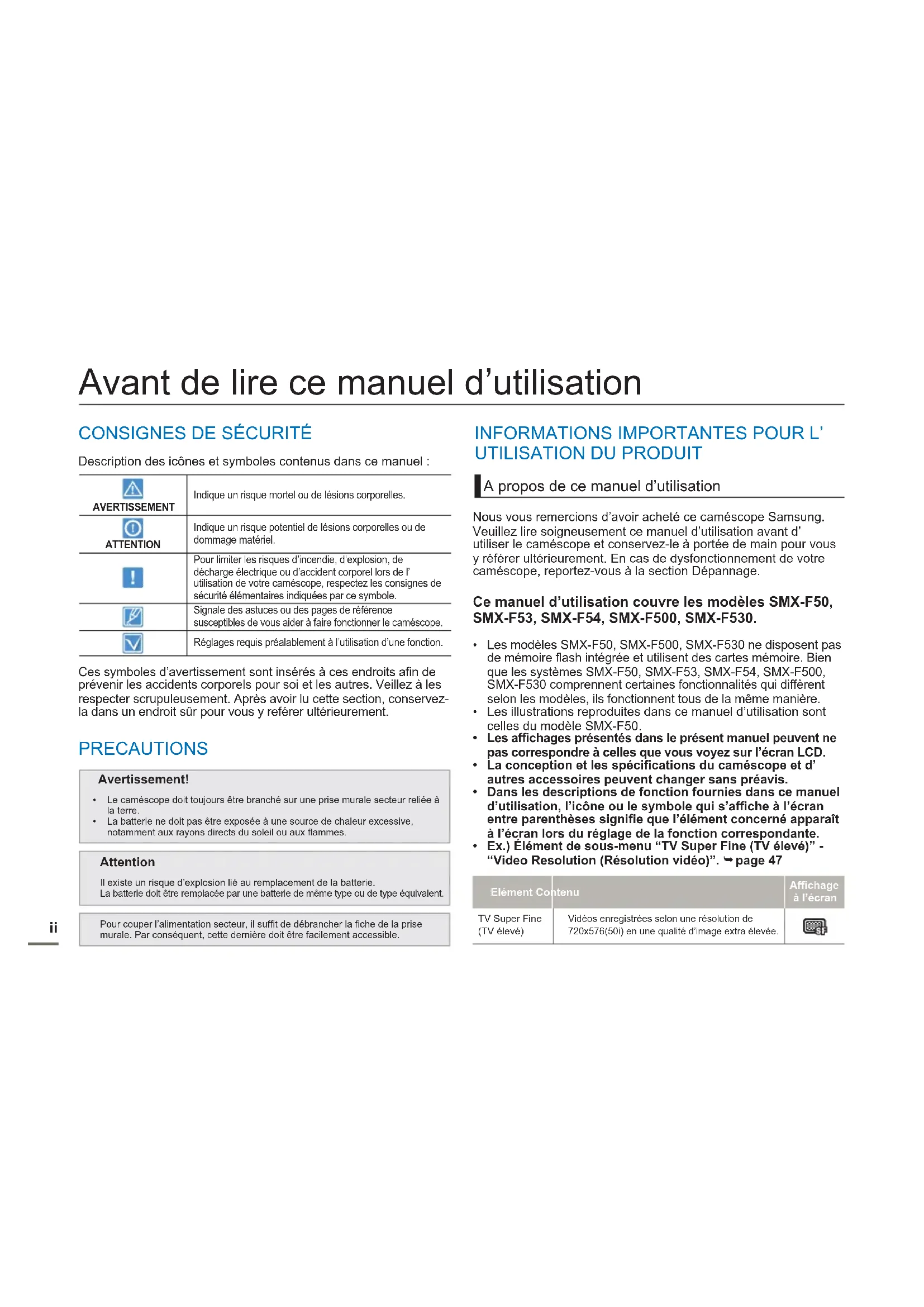 AttentionIl existe un risque d’explosion lié au remplacement de la batterie. La batterie doit être remplacée par une batterie de même type ou de type équivalent.Pour couper l’alimentation secteur, il suffit de débrancher la fiche de la prise murale. Par conséquent, cette dernière doit être facilement accessible.Nous vous remercions d’avoir acheté ce caméscope Samsung. Veuillez lire soigneusement ce manuel d’utilisation avant d’utiliser le caméscope et conservez-le à portée de main pour vous y référer ultérieurement. En cas de dysfonctionnement de votre caméscope, reportez-vous à la section Dépannage. Ce manuel d’utilisation couvre les modèles SMX-F50, SMX-F53, SMX-F54, SMX-F500, SMX-F530. Les modèles SMX-F50, SMX-F500, SMX-F530 ne disposent pas de mémoire flash intégrée et utilisent des cartes mémoire. Bien que les systèmes SMX-F50, SMX-F53, SMX-F54, SMX-F500, SMX-F530 comprennent certaines fonctionnalités qui diffèrent selon les modèles, ils fonctionnent tous de la même manière.Les illustrations reproduites dans ce manuel d’utilisation sont celles du modèle SMX-F50.Les affichages présentés dans le présent manuel peuvent ne pas correspondre à celles que vous voyez sur l’écran LCD.La conception et les spécifications du caméscope et d’autres accessoires peuvent changer sans préavis.Dans les descriptions de fonction fournies dans ce manuel d’utilisation, l’icône ou le symbole qui s’affiche à l’écran entre parenthèses signifie que l’élément concerné apparaît à l’écran lors du réglage de la fonction correspondante.Ex.) Élément de sous-menu “TV Super Fine (TV élevé)” - “Video Resolution (Résolution vidéo)”. page 47Elément ContenuAffichage à l’écranTV Super Fine (TV élevé)Vidéos enregistrées selon une résolution de 720x576(50i) en une qualité d’image extra élevée.