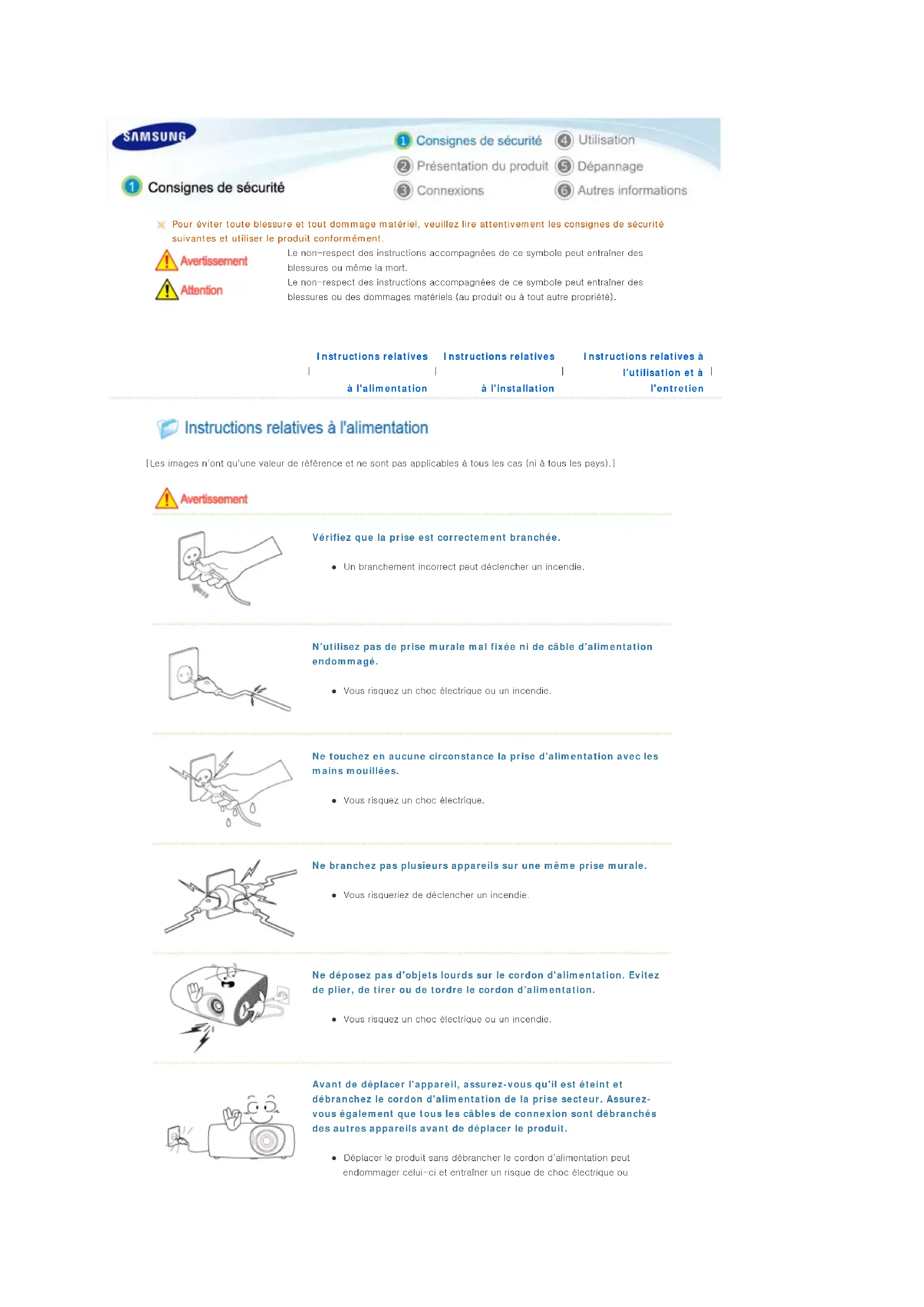 Vérifiez que la prise est correctement branchée. z Un branchement incorrect peut déclencher un incendie. N'utilisez pas de prise murale mal fixée ni de câble d'alimentation endommagé. z Vous risquez un choc électrique ou un incendie. Ne touchez en aucune circonstance la prise d'alimentation avec les mains mouillées. z Vous risquez un choc électrique. Ne branchez pas plusieurs appareils sur une même prise murale. z Vous risqueriez de déclencher un incendie. Ne déposez pas d'objets lourds sur le cordon d'alimentation. Evitez de plier, de tirer ou de tordre le cordon d'alimentation. z Vous risquez un choc électrique ou un incendie. Avant de déplacer l'appareil, assurez-vous qu'il est éteint et débranchez le cordon d'alimentation de la prise secteur. Assurez- vous également que tous les câbles de connexion sont débranchés des autres appareils avant de déplacer le produit. z Déplacer le produit sans débrancher le cordon d'alimentation peut endommager celui-ci et entraîner un risque de choc électrique oud'incendie. Pour déconnecter l'appareil du secteur, la prise doit être débranchée de la prise électrique du secteur. Par conséquent, la prise du secteur doit être en état de marche. z Ceci peut causer un choc électrique ou un incendie.