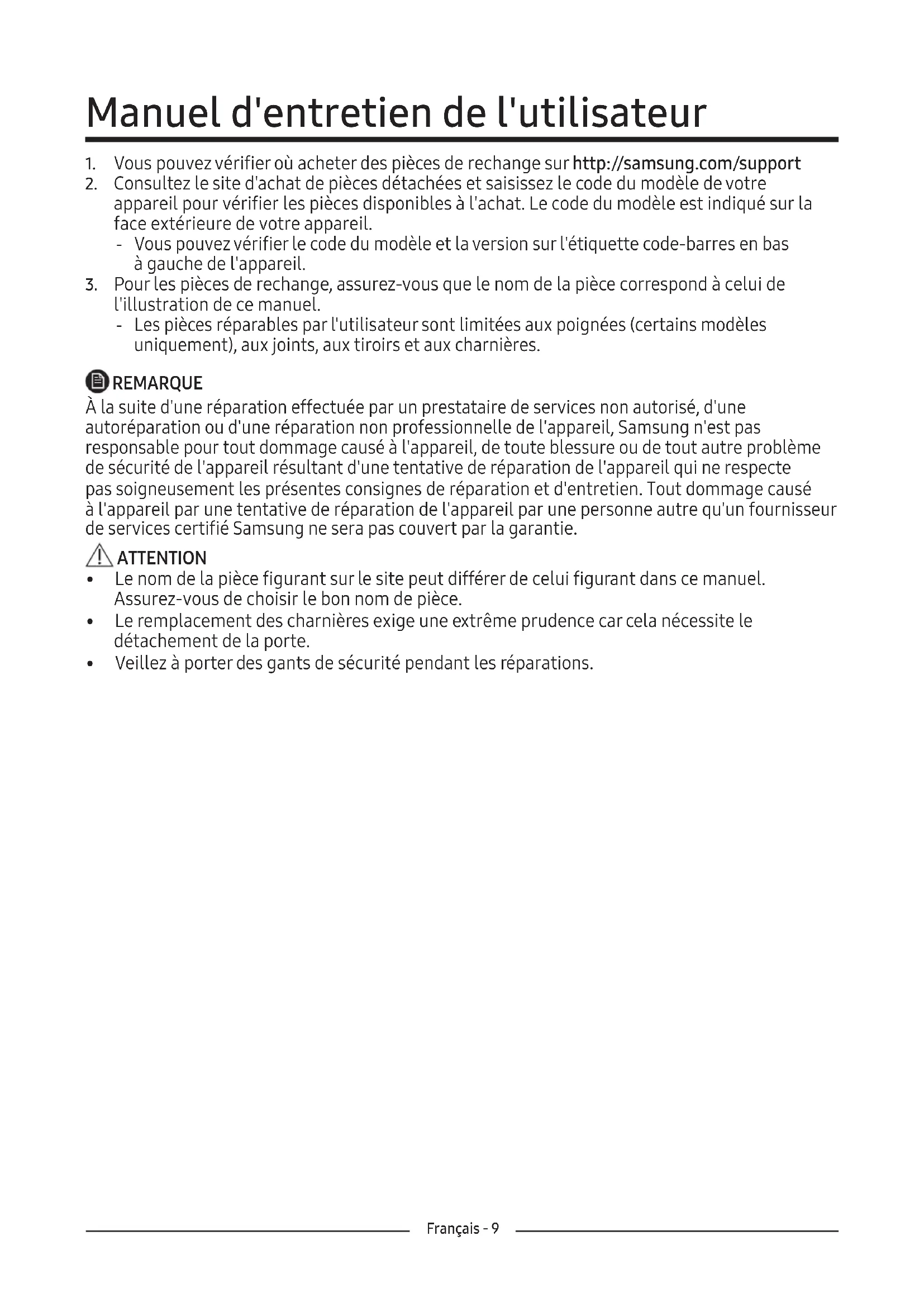 l'illustration de ce manuel. ‐ Les pièces réparables par l'utilisateur sont limitées aux poignées (certains modèles uniquement), aux joints, aux tiroirs et aux charnières. REMARQUE À la suite d'une réparation effectuée par un prestataire de services non autorisé, d'une autoréparation ou d'une réparation non professionnelle de l'appareil, Samsung n'est pas responsable pour tout dommage causé à l'appareil, de toute blessure ou de tout autre problème de sécurité de l'appareil résultant d'une tentative de réparation de l'appareil qui ne respecte passoigneusement les présentes consignes de réparation et d'entretien. Tout dommage causé àl'appareil par une tentative de réparation de l'appareil par une personne autre qu'un fournisseur de services certifié Samsung ne sera pas couvert par la garantie. ATTENTION