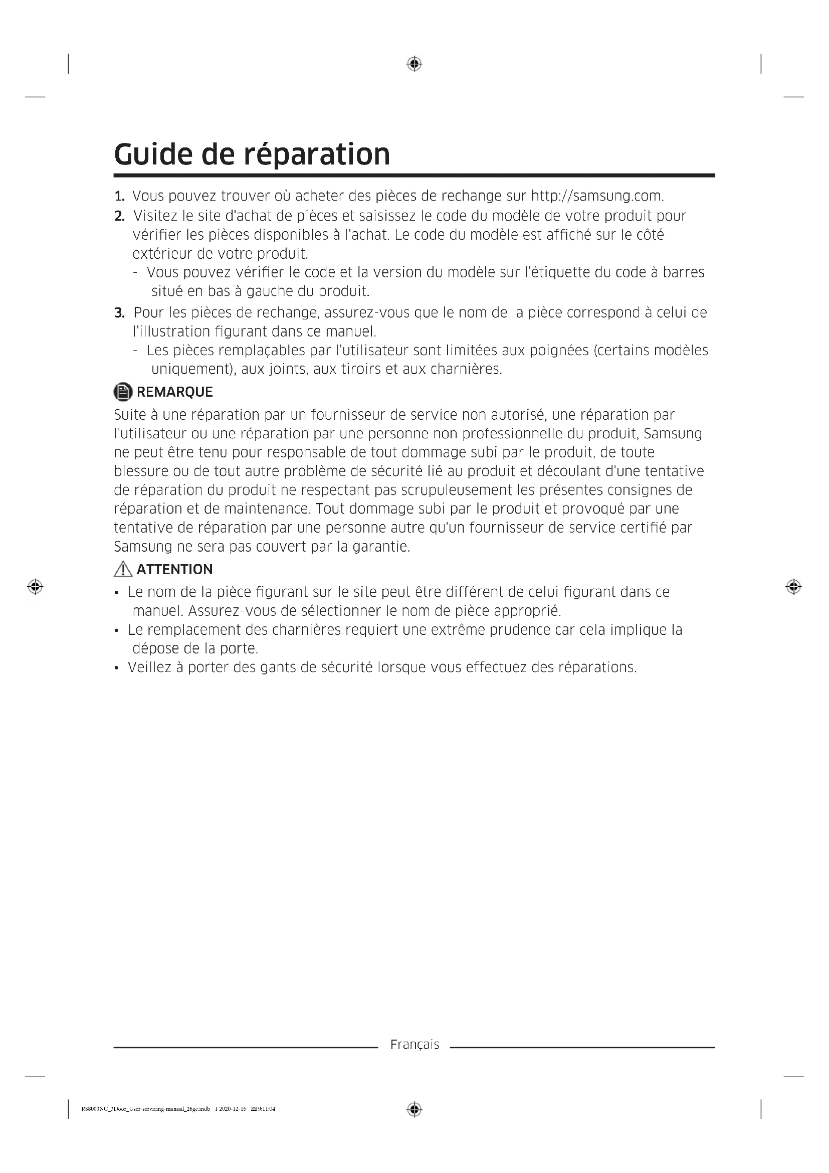 - Veillez à porter des gants de sécurité lorsque vous effectuez des réparations. RS8000NC_3Door_User-servicing-manual_26ge.indb 1 2020-12-15 9:11:04Français L'apparence réelle et les pièces fournies avec le réfrigérateur peuvent varier en fonction du modèle et du pays.