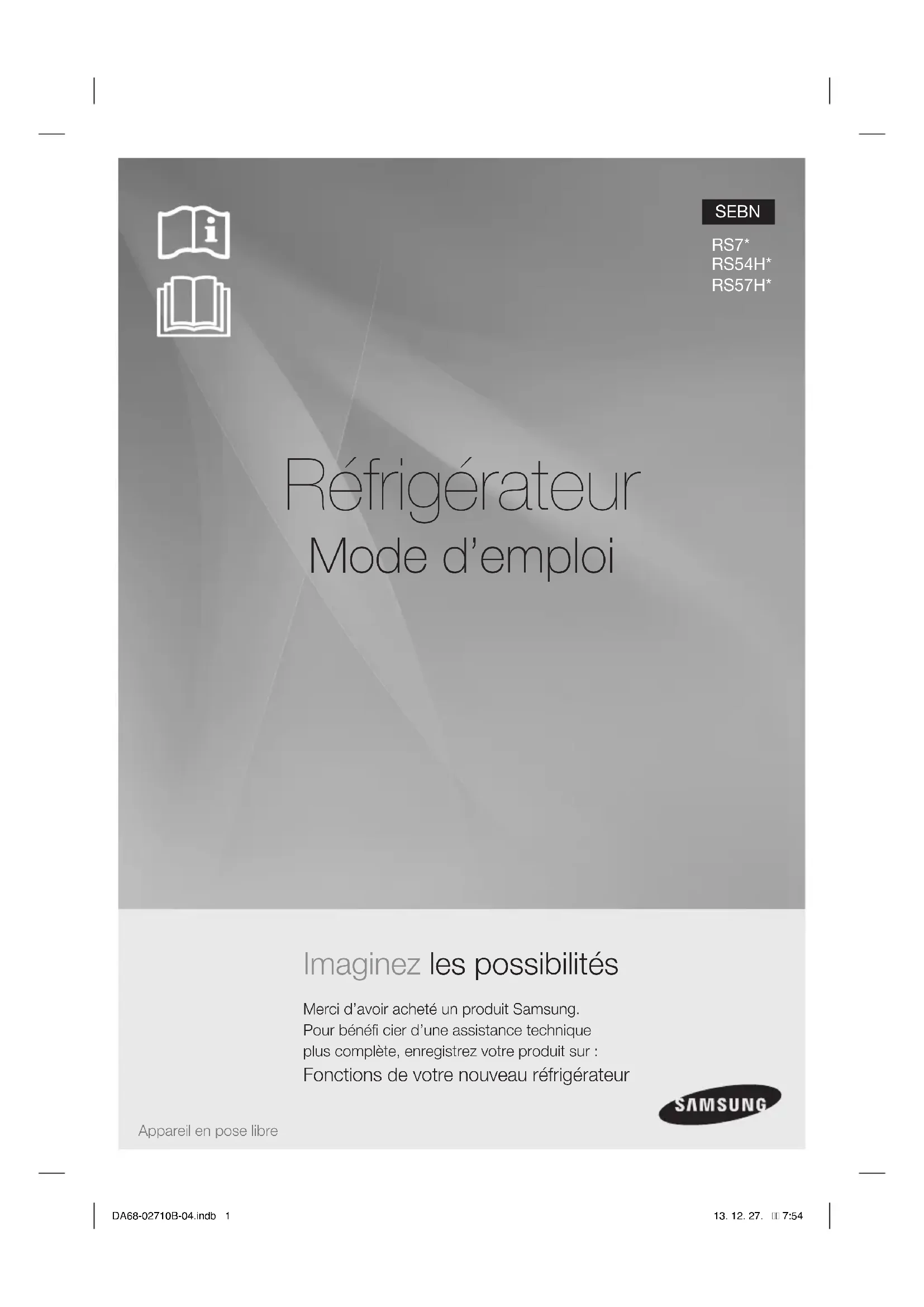 Réfrigérateur Mode d’emploi Imaginez les possibilités Merci d’avoir acheté un produit Samsung.Pour bénéfi cier d’une assistance techniqueplus complète, enregistrez votre produit sur : Fonctions de votre nouveau réfrigérateur Appareil en pose libre SEBN RS7* RS54H* RS57H* DA68-02710B-04.indb 1DA68-02710B-04.indb 1 13. 12. 27. 7:5413. 12. 27. 7:54Français - 2