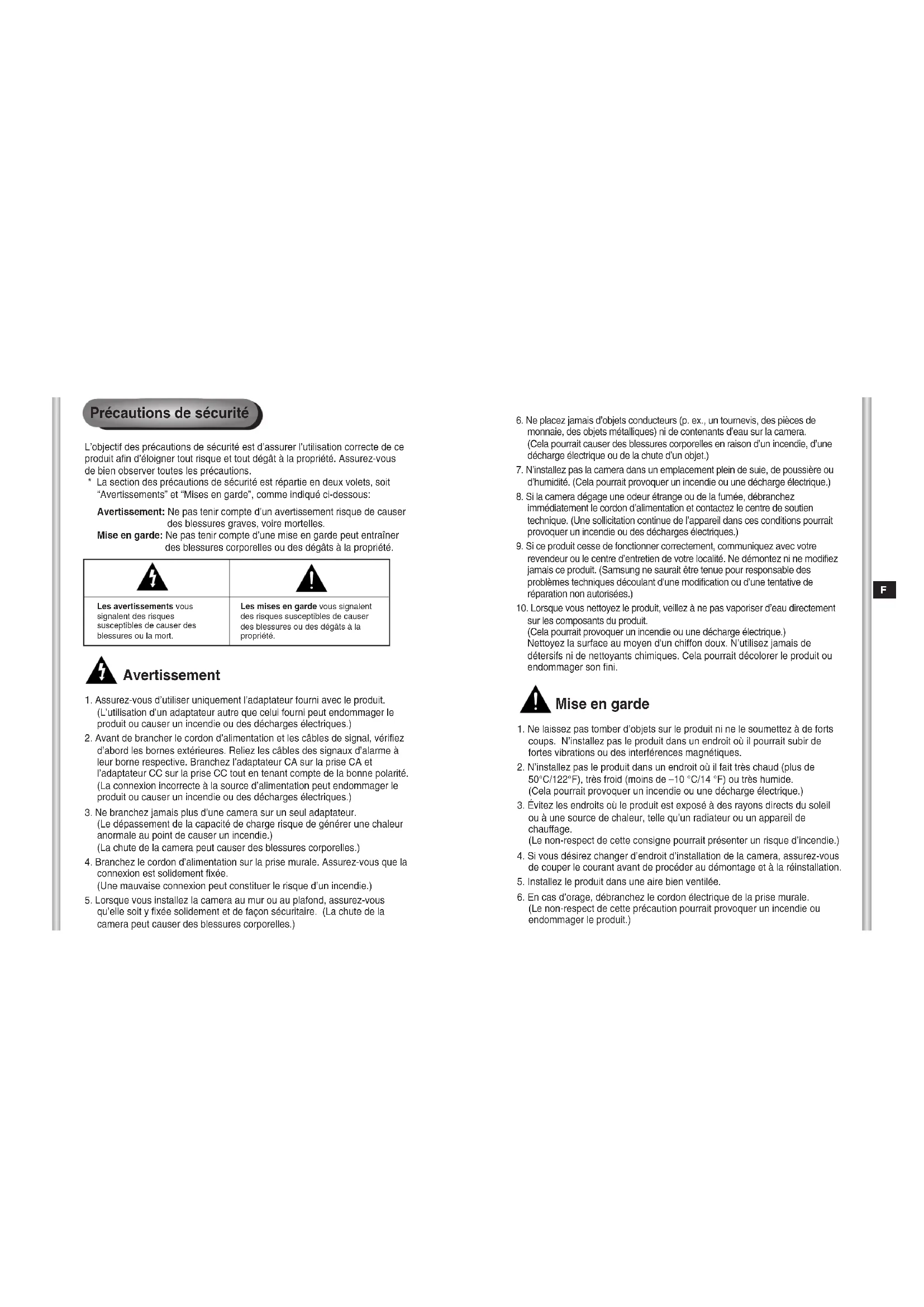 (Le non-respect de cette précaution pourrait provoquer un incendie ou endommager le produit.) Avertissement
