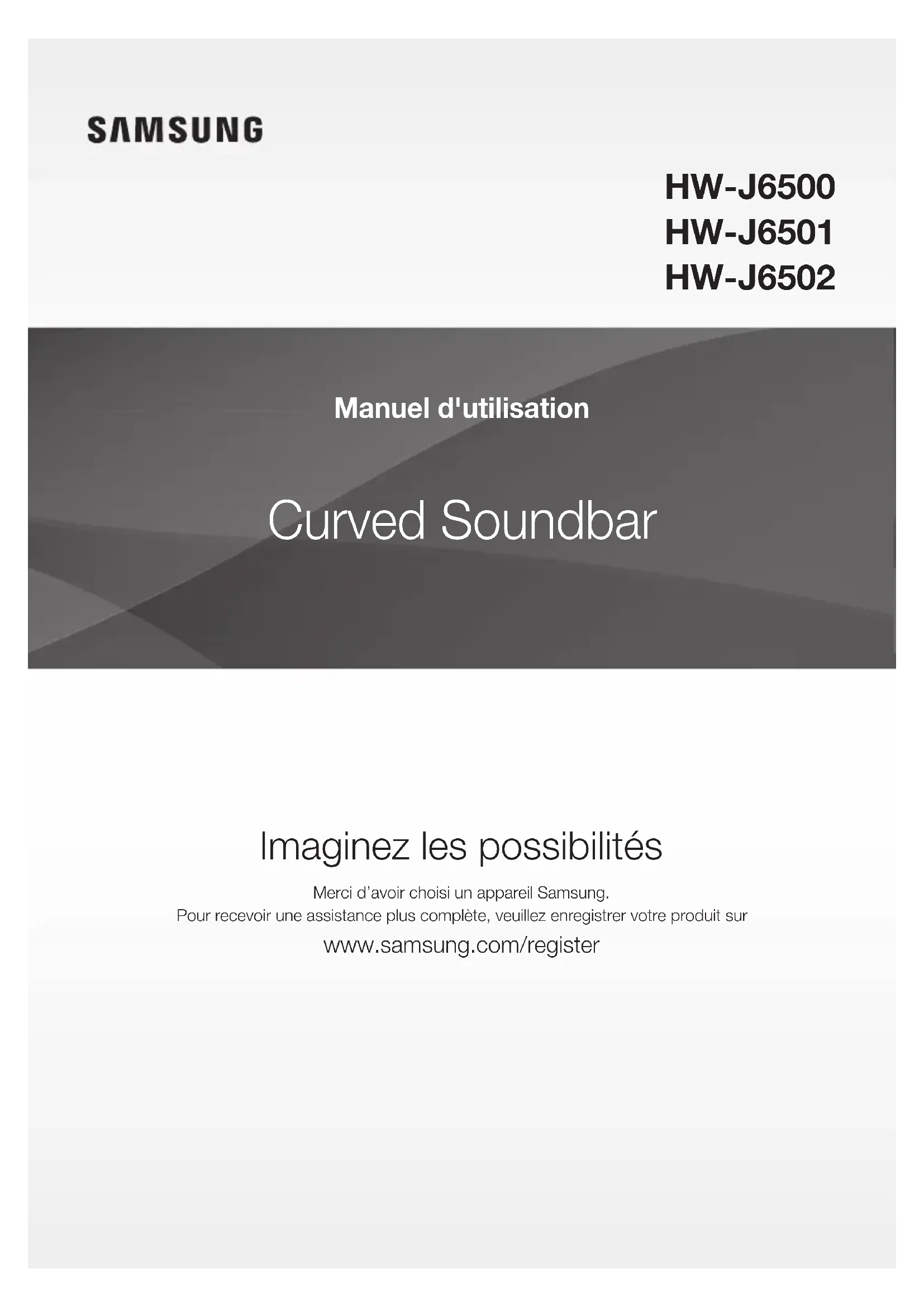 Samsung Electronics Czech and Slovak, s.r.o. V Parku 2343/24, 148 00 - Praha 4 CROATIA 072 726 786 www.samsung.com/hr/support BOSNIA 055 233 999 www.samsung.com/support MONTENE- GRO 020 405 888 www.samsung.com/support SLOVENIA 080 697 267 (brezplačna številka) 090 726 786 (0,39 EUR/min) klicni center vam je na voljo od ponedeljka do petka od 9. do 18. ure. www.samsung.com/si SERBIA 011 321 6899 www.samsung.com/rs/support BULGARIA 800 111 31 , Безплатна телефонна линия www.samsung.com/bg/support ROMANIA 08008 726 78 64 (08008 SAMSUNG ) Apel GRATUIT www.samsung.com/ro/support CYPRUS 8009 4000 only from landline, toll free www.samsung.com/gr/support GREECE 80111-SAMSUNG (80111 726 7864) only from land line (+30) 210 6897691 from mobile and land line LITHUANIA 8-800-77777 www.samsung.com/lt/support LATVIA 8000-7267 www.samsung.com/lv/support ESTONIA 800-7267 www.samsung.com/ee/support [Correct disposal of batteries in this product] (Applicable in countries with separate collection systems) This marking on the battery, manual or packaging indicates that the batteries in this product should not be disposed of with other household waste at the end of their working life. Where marked, the chemical symbols Hg, Cd or Pb indicate that the battery contains mercury, cadmium or lead above the reference levels in EC Directive 2006/66. If batteries are not properly disposed of, these substances can cause harm to human health or the environment. To protect natural resources and to promote material reuse, please separate batteries from other types of waste and recycle them through your local, free battery return system. Correct Disposal of This Product (Waste Electrical & Electronic Equipment) (Applicable in countries with separate collection systems) This marking on the product, accessories or literature indicates that the product and its electronic accessories (e.g. charger, headset, USB cable) should not be disposed of with other household waste at the end of their working life. To prevent possible harm to the environment or human health from uncontrolled waste disposal, please separate these items from other types of waste and recycle them responsibly to promote the sustainable reuse of material resources. Household users should contact either the retailer where they purchased this product, or their local government office, for details of where and how they can take these items for environmentally safe recycling. Business users should contact their supplier and check the terms and conditions of the purchase contract. This product and its electronic accessories should not be mixed with other commercial wastes for disposal. ©2015 Samsung Electronics Co.,Ltd. All rights reservedCurved Soundbar Imaginez les possibilités Merci d’avoir choisi un appareil Samsung.Pour recevoir une assistance plus complète, veuillez enregistrer votre produit sur www.samsung.com/register Manuel d'utilisation HW-J6500 HW-J6501 HW-J650232 DÉMARRAGE CARACTÉRISTIQUES Services de musique en streaming La Curved Soundbar vous permet d'accéder encore plus facilement à votre musique préférée, grâce à ses fonctionnalités Wi-Fi. Accès facile à l'application Samsung Multiroom pour profiter au maximum des services de musique en streaming disponibles avec votre abonnement Internet. Expansion du son ambiophonique La fonctionnalité Expansion du son ambiophonique ajoute de la profondeur et de la grandeur au son. TV SoundConnect Connectez facilement votre téléviseur à la Soundbar via Bluetooth avec TV SoundConnect. L'absence des câbles qui trainent entre la Soundbar et le téléviseur vous permet de mettre en valeur le design plat et sobre de deux systèmes tout en conservant une apparence soignée de votre salon. Vous contrôlez facilement la Soundbar et le téléviseur depuis une seule télécommande. Partage des sources de musique (= lecture Multiroom) Grâce à Multiroom Link, il est facile de contrôler et de partager une seule source de musique à travers plusieurs périphériques audio à différents emplacements. L'application mobile contrôle le volume et la musique sur votre système à travers différents périphériques, y compris votre téléviseur, la Soundbar, le système audiovisuel et le lecteur de disque Blu-ray. Bénéficiez du son de votre choix, où vous voulez. HDMI L'interface HDMI permet la transmission simultanée des signaux audio et vidéo pour vous offrir une image plus nette. L'appareil est également équipé de la fonction ARC qui vous permet d'écouter le son de votre téléviseur sur le Soundbar via un câble HDMI. Cette fonction est uniquement disponible si vous connectez l'appareil à un téléviseur compatible ARC. Prise en charge de la fonction Hôte USB Vous pouvez connecter des périphériques de stockage USB externes (lecteur MP3, mémoire flash USB, etc.) afin d’en lire les fichiers musicaux à l’aide de la fonction USB HOST du système Soundbar. Fonction Bluetooth Vous pouvez connecter un périphérique Bluetooth à l'Ensemble Soundbar pour écouter de la musique avec un son stéréo de haute qualité, tout cela sans fil! LICENCE Fabriqué sous licence par Dolby Laboratories. Dolby et le symbole représentant deux D sont des marques de commerce de Dolby Laboratories. Pour les brevets DTS, consultez le site http://patents.dts. com. Fabriqué sous licence de DTS Licensing Limited. DTS, le symbole, & DTS et le symbole qui lui est associé sont des marques déposées, et DTS 2.0 Channel est une marque déposée de DTS, Inc. © DTS, Inc. Tous droits réservés. Les termes HDMI et HDMI High-Definition Multimedia Interface, et le logo HDMI sont des marques de commerce ou des marques déposées de HDMI Licensing LLC aux États-Unis et dans d'autres pays. démarrage3 FRA DÉMARRAGE