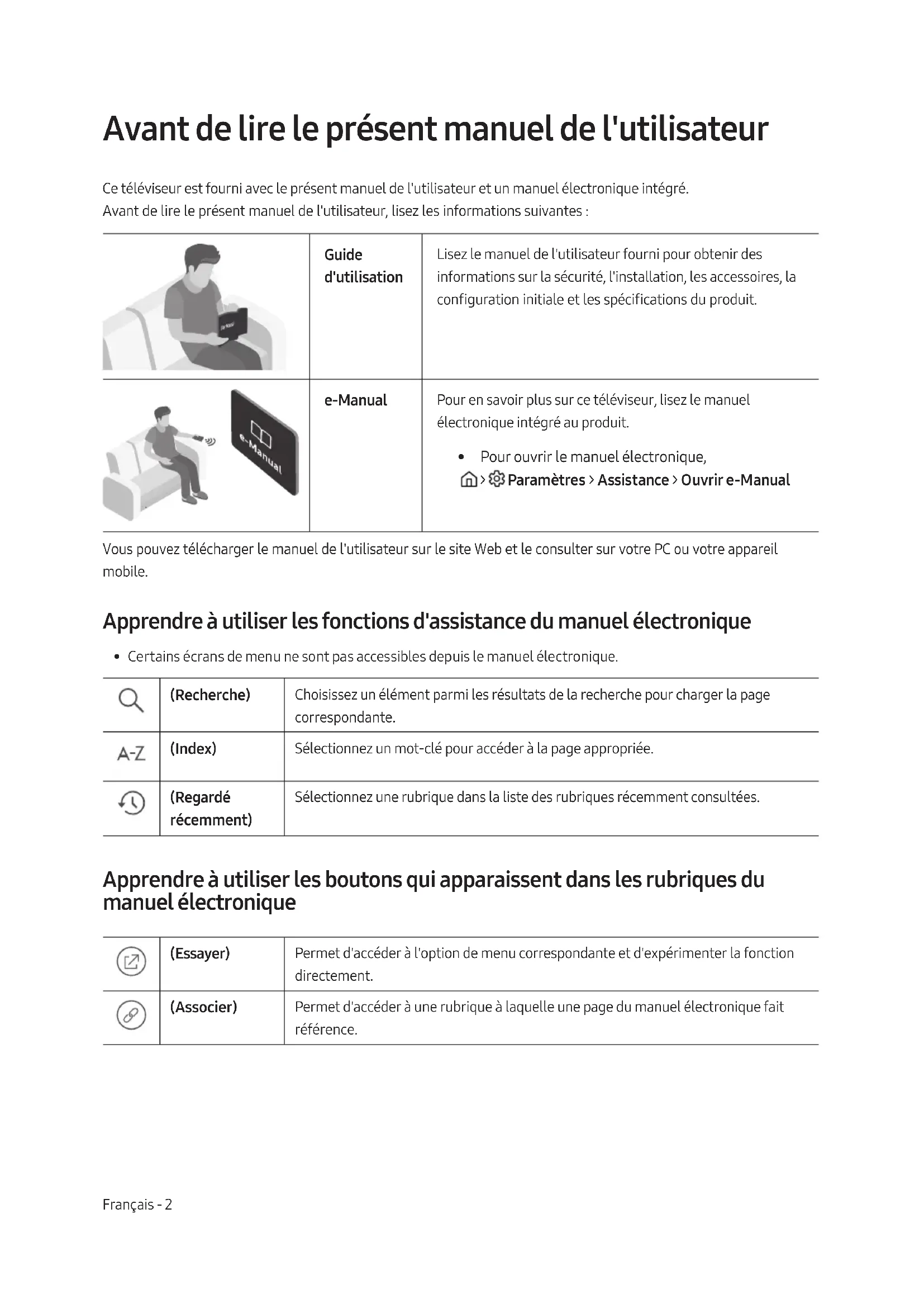- Pour ouvrir le manuel électronique, > Paramètres > Assistance > Ouvrir e-Manual Vous pouvez télécharger le manuel de l'utilisateur sur le site Web et le consulter sur votre PC ou votre appareil mobile. Apprendre à utiliser les fonctions d'assistance du manuel électronique