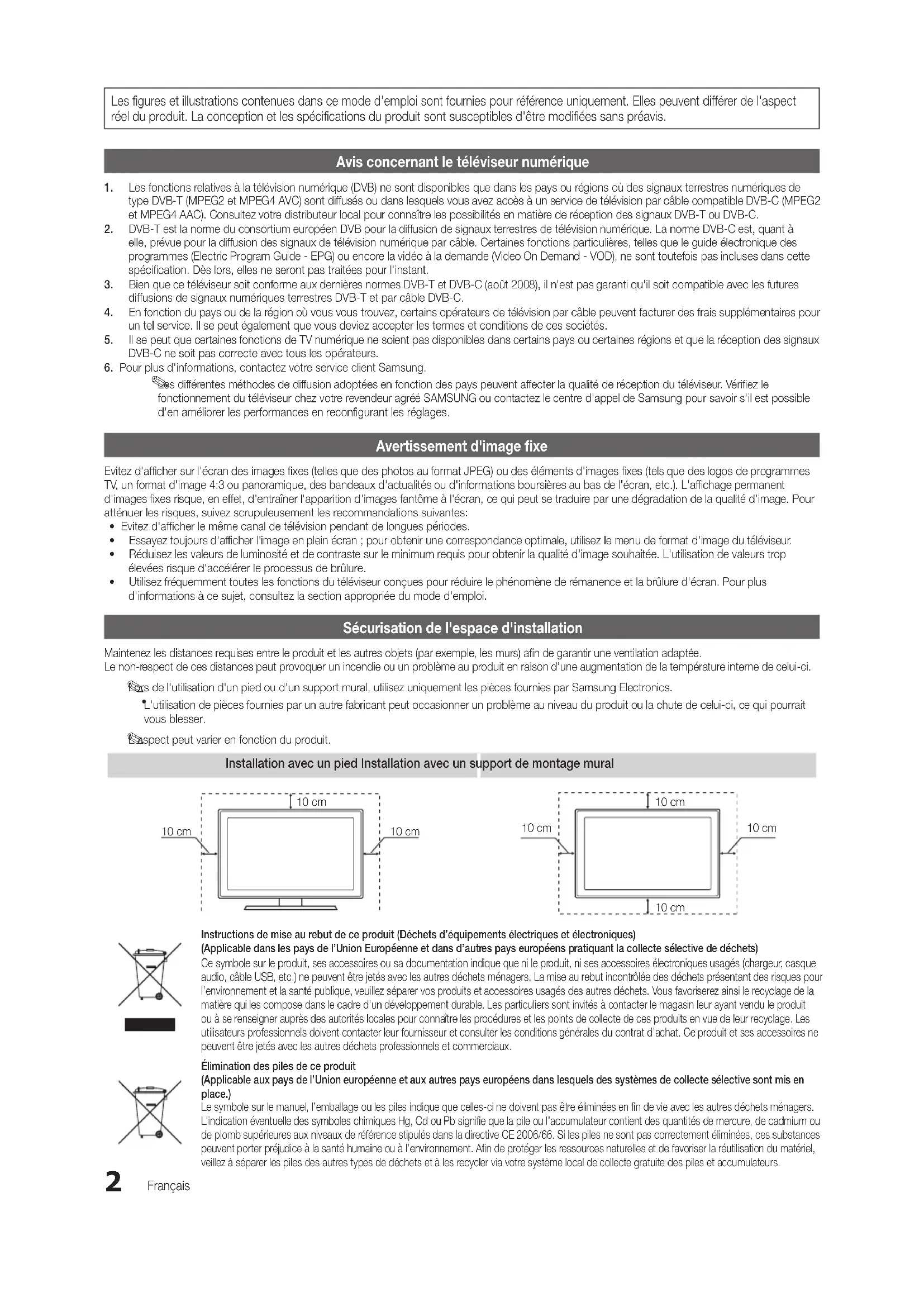 L'aspect peut varier en fonction du produit. Installation avec un pied Installation avec un support de montage mural Instructions de mise au rebut de ce produit (Déchets d’équipements électriques et électroniques) (Applicable dans les pays de l’Union Européenne et dans d’autres pays européens pratiquant la collecte sélective de déchets) Ce symbole sur le produit, ses accessoires ou sa documentation indique que ni le produit, ni ses accessoires électroniques usagés (chargeur, casque audio, câble USB, etc.) ne peuvent être jetés avec les autres déchets ménagers. La mise au rebut incontrôlée des déchets présentant des risques pour l’environnement et la santé publique, veuillez séparer vos produits et accessoires usagés des autres déchets. Vous favoriserez ainsi le recyclage de la matière qui les compose dans le cadre d’un développement durable. Les particuliers sont invités à contacter le magasin leur ayant vendu le produit ou à se renseigner auprès des autorités locales pour connaître les procédures et les points de collecte de ces produits en vue de leur recyclage. Les utilisateurs professionnels doivent contacter leur fournisseur et consulter les conditions générales du contrat d’achat. Ce produit et ses accessoires ne peuvent être jetés avec les autres déchets professionnels et commerciaux. Élimination des piles de ce produit (Applicable aux pays de l’Union européenne et aux autres pays européens dans lesquels des systèmes de collecte sélective sont mis en place.) Le symbole sur le manuel, l’emballage ou les piles indique que celles-ci ne doivent pas être éliminées en fin de vie avec les autres déchets ménagers. L’indication éventuelle des symboles chimiques Hg, Cd ou Pb signifie que la pile ou l’accumulateur contient des quantités de mercure, de cadmium ou de plomb supérieures aux niveaux de référence stipulés dans la directive CE2006/66. Si les piles ne sont pas correctement éliminées, ces substances peuvent porter préjudice à la santé humaine ou à l’environnement. Afin de protéger les ressources naturelles et de favoriser la réutilisation du matériel, veillez à séparer les piles des autres types de déchets et à les recycler via votre système local de collecte gratuite des piles et accumulateurs. 10 cm 10 cm 10 cm 10 cm 10 cm 10 cm 10 cm [UC6000-Weuro]BN68-02748A.indb 2 2010-02-25 오전 3:40:193 FRANÇAIS Français Vérifiez la présence du symbole!