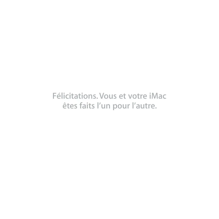 Prêt, feu, configurez ! www.apple.com/fr/imac Centre d’aide Assistant migration Votre iMac est conçu pour que vous puissiez le configurer facilement et commencer à travailler immédiatement. Si vous n’avez jamais utilisé d’iMac ou que vous n’êtes pas familiarisé avec les ordinateurs Mac, vous trouverez dans ce chapitre des informations qui vous aideront à débuter. Important : Lisez toutes les instructions d’installation, ainsi que les informations concernant la sécurité à la page 68 avant de brancher votre iMac sur une prise de courant. Si vous êtes un utilisateur expérimenté, peut-être êtes-vous déjà en mesure d’utiliser votre nouvel ordinateur. Veillez néanmoins à consulter les informations du chapitre 2, « Votre iMac au quotidien » à la page 19 pour découvrir les nouvelles fonctionnalités de cet iMac. Le Centre d’aide contient de nombreuses réponses aux questions concernant votre iMac. Pour en savoir plus sur le Centre d’aide, consultez la rubrique « Comment obtenir des réponses à vos doutes » à la page 34. Retirez tout film protecteur présent sur l’extérieur de votre iMac avant de configurer ce dernier.