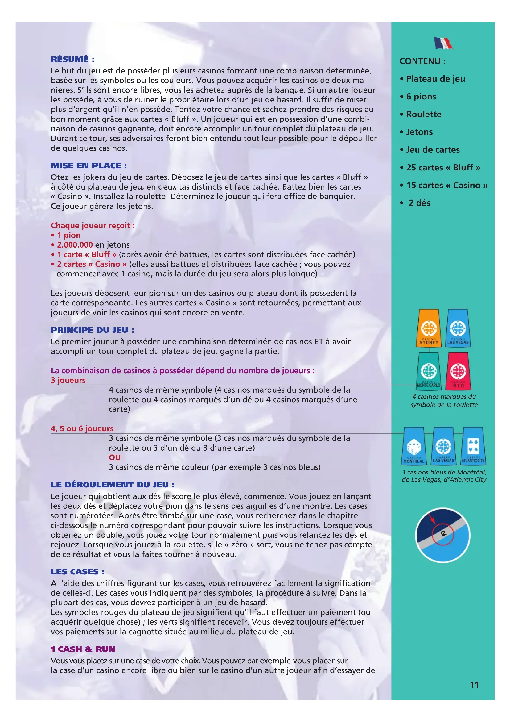 4 casinos marqués du symbole de la roulette 3 casinos bleus de Montréal, de Las Vegas, d’Atlantic Cityle ruiner ou encore vous rendre sur la case « Bluff » pour y acheter une carte « Bluff ». Mais, si vous êtes en train d’accomplir votre dernier tour de Cash & Run (voir ci-après), ce qui figure ci-dessus ne s’applique pas et rien ne se passe. 2 CASINO Si vous tombez sur un casino n’appartenant pas encore à un joueur, vous pouvez l’acquérir pour 100.000. Placez cette somme sur la cagnotte située au milieu du plateau et recevez en échange la carte du casino comme titre de propriété. Si vous tombez sur un casino vous appartenant, vous devez relancer les dés. Si vous tombez sur le casino d’un autre joueur, vous devez jouer avec son propriétaire à un jeu de hasard. La case casino indique s’il s’agit d’un « casino roulette », d’un « casino dé » ou d’un « casino jeu de cartes ». A vous de décider de la somme misée. Déposez les jetons sur la case du jeu de votre choix. Dans les « casinos roulette », le joueur choisit entre les trois jeux suivants: