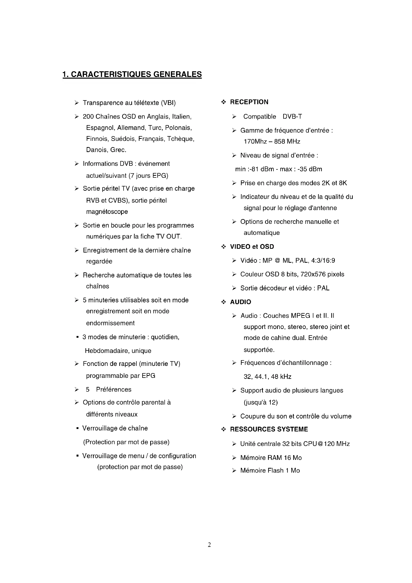 Transparence au télétexte (VBI) 200 Chaînes OSD en Anglais, Italien, Espagnol, Allemand, Turc, Polonais, Finnois, Suédois, Français, Tchéque, Danois, Grec. Informations DVB : événement actuel/suivant (7 jours EPG) Sortie péritel TV (avec prise en charge RVB et CVBS), sortie péritel magnétoscope Sortie en boucle pour les programmes numériques par la fiche TV OUT. Enregistrement de la dernière chaine regardée Recherche automatique de toutes les chaînes 5 minuteries utilisables soit en mode enregistrement soit en mode endormissement - 3 modes de minuterie : quotidien, hebdomadaire, unique Fonction de rappel (minuterie TV) programmable par EPG 5 Préférences Options de contrôle parental à différents niveaux - Verrouillage de chaine (Protection par mot de passe) - Verrouillage de menu / de configuration (protection par mot de passe)