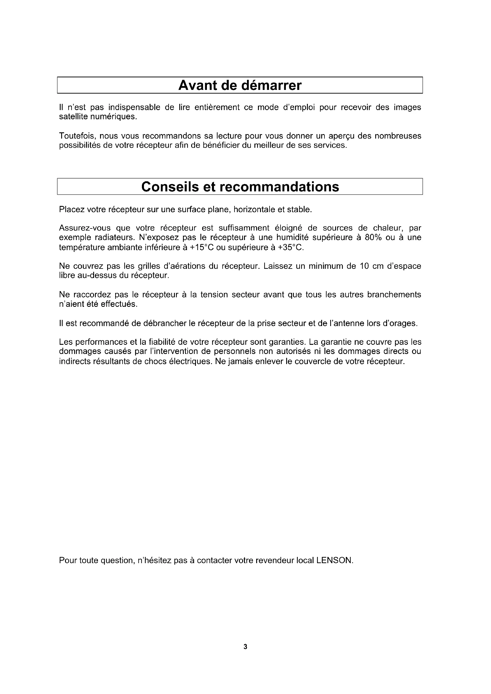 Les performances et la fiabilité de votre récepteur sont garanties. La garantie ne couvre pas les dommages causés par l'intervention de personnes non autorisés ni les dommages directs ou indirects résultats de chocs électriques. Ne jamais enlever le couvercle de votre récepteur.
