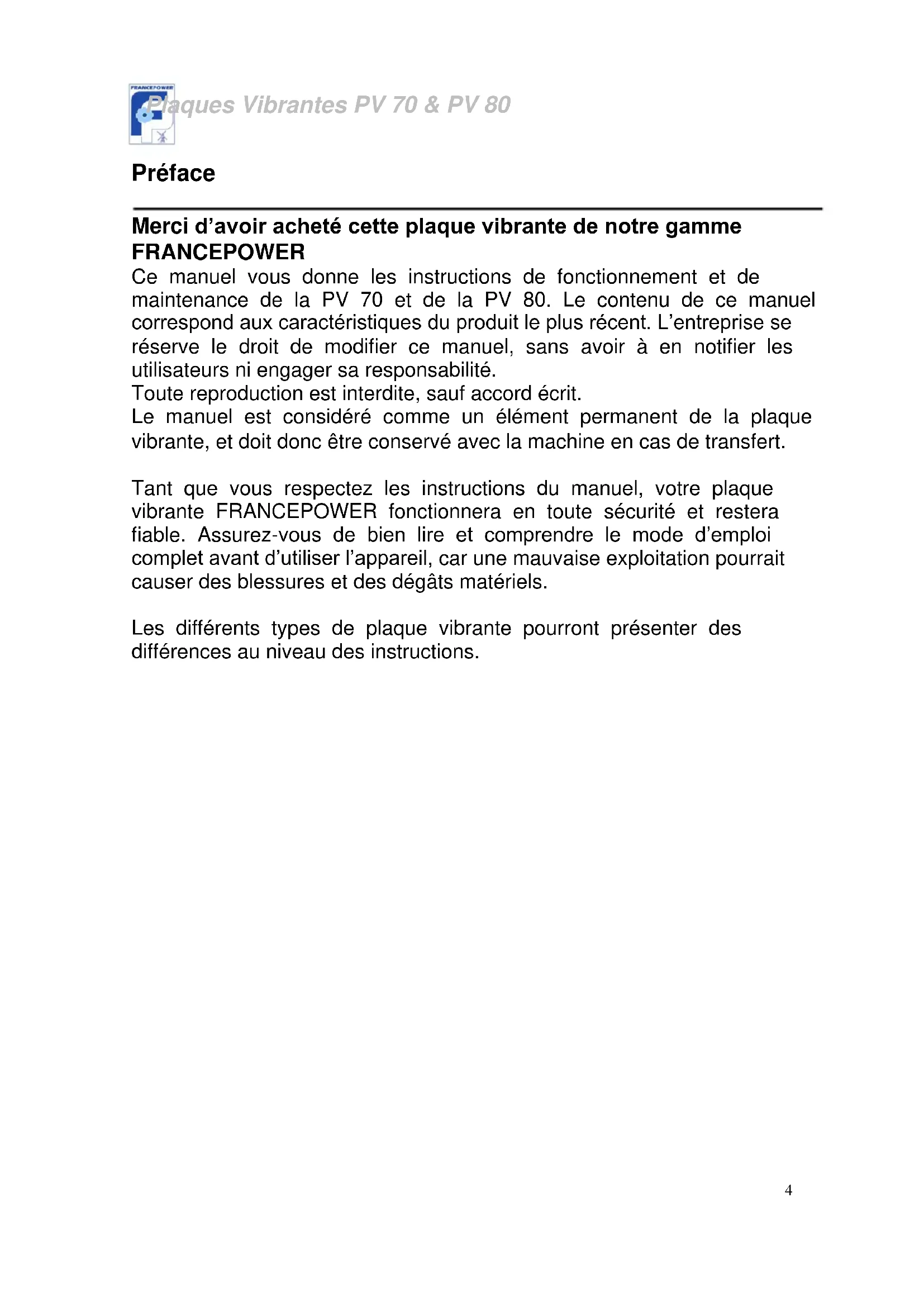 Tant que vous respectez les instructions du manuel, votre plaque vibrante FRANCEPOWER fonctionnera en toute sécurité et restera fiable. Assurez-vous de bien dire et comprendre le mode d'emploi complet avant d'utiliser l'appareil, car une mauvaise exploitation pourrait cause des blessures et des dégats matériels.