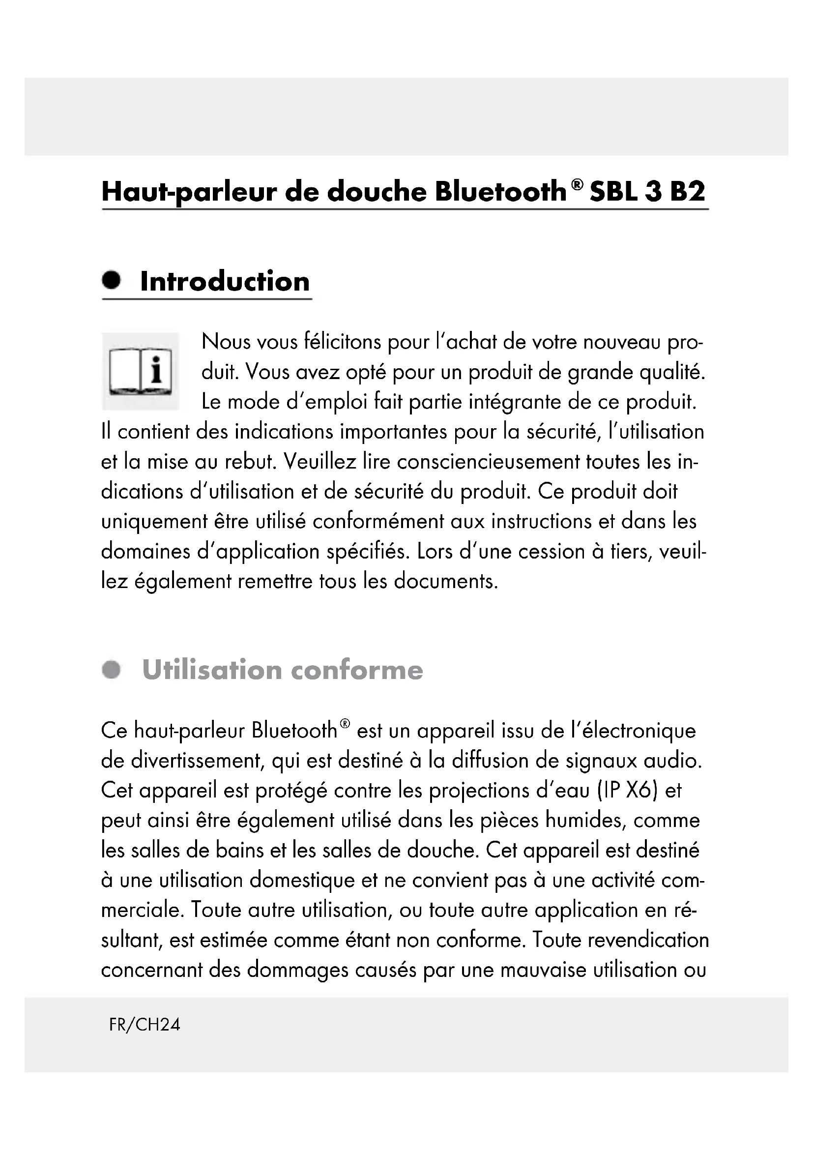 SBL 3 B2 Introduction Nous vous félicitons pour l‘achat de votre nouveau pro- duit. Vous avez opté pour un produit de grande qualité. Le mode d‘emploi fait partie intégrante de ce produit. Il contient des indications importantes pour la sécurité, l’utilisation et la mise au rebut. Veuillez lire consciencieusement toutes les in- dications d‘utilisation et de sécurité du produit. Ce produit doit uniquement être utilisé conformément aux instructions et dans les domaines d‘application spécifiés. Lors d‘une cession à tiers, veuil- lez également remettre tous les documents. Utilisation conforme Ce haut-parleur Bluetooth