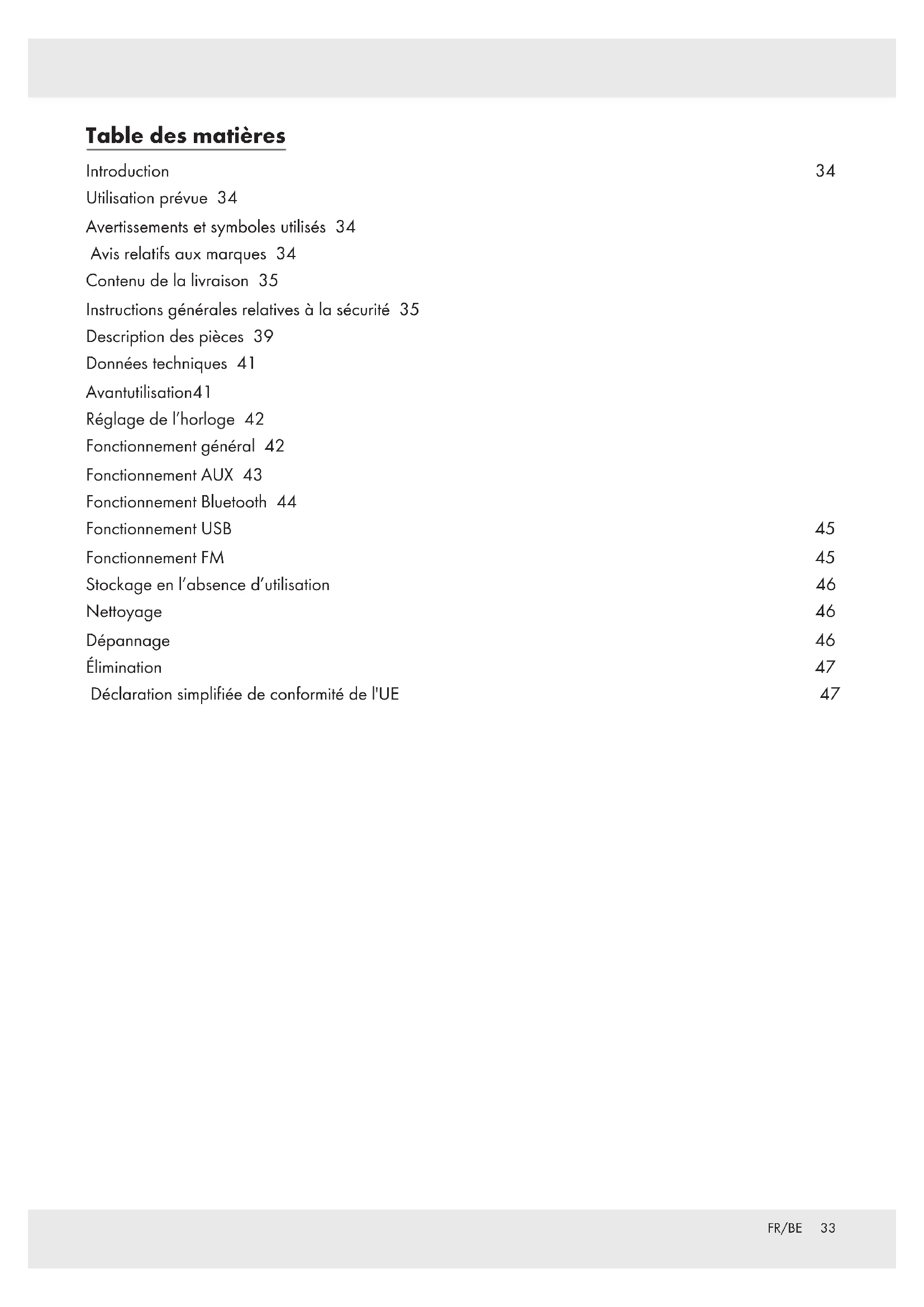 SPEAKER TOWER HG03084, is in compliance with Directives 2014/53/EU, 2011/65/EU and 2009/125/EC. The full text of the EU declaration of conformity is available at the following internet address: www.owim.comFR/BE 33 Table des matières Introduction 34 Utilisation prévue 34 Avertissements et symboles utilisés 34 Avis relatifs aux marques 34 Contenu de la livraison 35 Instructions générales relatives à la sécurité 35 Description des pièces 39 Données techniques 41 Avant utilisation 41 Réglage de l’horloge 42 Fonctionnement général 42 Fonctionnement AUX 43 Fonctionnement Bluetooth 44 Fonctionnement USB 45 Fonctionnement FM 45 Stockage en l’absence d’utilisation 46 Nettoyage 46 Dépannage 46 Élimination 47 Déclaration simplifiée de conformité de l'UE 4734 FR/BE Remarque : Ce symbole avec le terme signal fournit des informations utiles supplémentaires. Faites attention en utilisant le produit. L’écoute prolongée à fort volume peut nuire à votre audition. Avant d'utiliser le produit, réglez le volume au niveau le plus bas. ATTENTION ! RISQUE D'EXPLOSION ! Un avertissement avec ce symbole et le terme «ATTENTION! RISQUE D'EXPLOSION» indique une menace potentielle d’explosion. Le fait de ne pas respect de cet avertissement peut entraîner des blessures graves ou mortelles et des dégâts matériels potentiels. Suivez les instructions de cet avertissement pour éviter les blessures graves, les dangers de morts et les dégâts matériels ! Ce signe d’action indique de porter des gants de protection appropriés ! Suivez les instructions pour éviter les coups portés aux mains par des objets ou le contact avec des matériaux thermiques ou chimiques. Avis relatifs aux marques