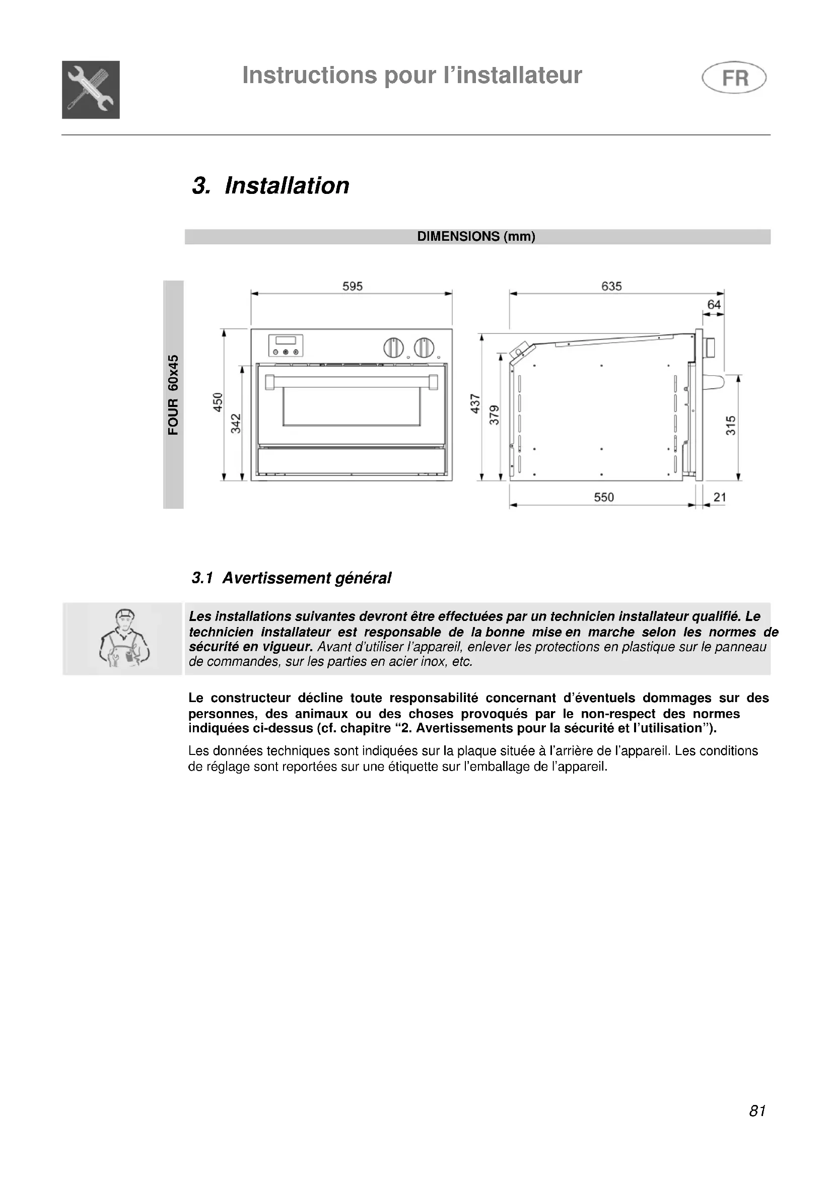 Le constructeur décline toute responsabilité concernant d’éventuels dommages sur des personnes, des animaux ou des choses provoqués par le non-respect des normes indiquées ci-dessus (cf. chapitre “2. Avertissements pour la sécurité et l’utilisation”). Les données techniques sont indiquées sur la plaque située à l’arrière de l’appareil. Les conditions de réglage sont reportées sur une étiquette sur l’emballage de l’appareil.Instructions pour l’installateur