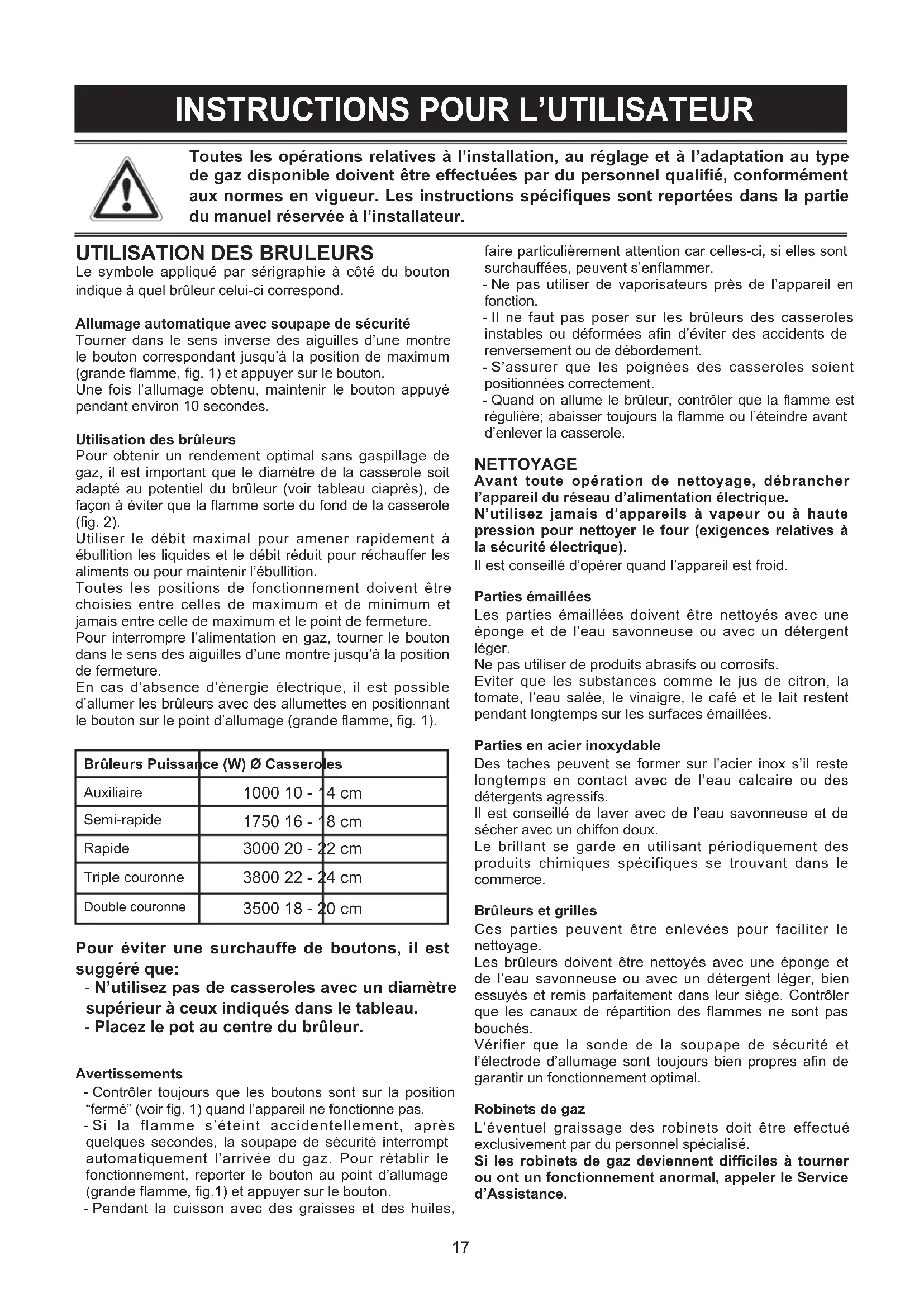 Le symbole appliqué par sérigraphie à côté du bouton indique à quel brûleur celui-ci correspond. Allumage automatique avec soupape de sécurité Tourner dans le sens inverse des aiguilles d’une montre le bouton correspondant jusqu’à la position de maximum (grande flamme, fig. 1) et appuyer sur le bouton. Une fois l’allumage obtenu, maintenir le bouton appuyé pendant environ 10 secondes. Utilisation des brûleurs Pour obtenir un rendement optimal sans gaspillage de gaz, il est important que le diamètre de la casserole soit adapté au potentiel du brûleur (voir tableau ciaprès), de façon à éviter que la flamme sorte du fond de la casserole (fig. 2). Utiliser le débit maximal pour amener rapidement à ébullition les liquides et le débit réduit pour réchauffer les aliments ou pour maintenir l’ébullition. Toutes les positions de fonctionnement doivent être choisies entre celles de maximum et de minimum et jamais entre celle de maximum et le point de fermeture. Pour interrompre l’alimentation en gaz, tourner le bouton dans le sens des aiguilles d’une montre jusqu’à la position de fermeture. En cas d’absence d’énergie électrique, il est possible d’allumer les brûleurs avec des allumettes en positionnant le bouton sur le point d’allumage (grande flamme, fig. 1). Brûleurs Puissance (W) Ø Casseroles Auxiliaire 1000 10 - 14 cm Semi-rapide 1750 16 - 18 cm Rapide 3000 20 - 22 cm Triple couronne 3800 22 - 24 cm Double couronne 3500 18 - 20 cm Pour éviter une surchauffe de boutons, il est suggéré que: - N’utilisez pas de casseroles avec un diamètre supérieur à ceux indiqués dans le tableau. - Placez le pot au centre du brûleur. Avertissements - Contrôler toujours que les boutons sont sur la position “fermé” (voir fig. 1) quand l’appareil ne fonctionne pas. - Si la flamme s’éteint accidentellement, après quelques secondes, la soupape de sécurité interrompt automatiquement l’arrivée du gaz. Pour rétablir le fonctionnement, reporter le bouton au point d’allumage (grande flamme, fig.1) et appuyer sur le bouton. - Pendant la cuisson avec des graisses et des huiles, faire particulièrement attention car celles-ci, si elles sont surchauffées, peuvent s’enflammer. - Ne pas utiliser de vaporisateurs près de l’appareil en fonction. - Il ne faut pas poser sur les brûleurs des casseroles instables ou déformées afin d’éviter des accidents de renversement ou de débordement. - S’assurer que les poignées des casseroles soient positionnées correctement. - Quand on allume le brûleur, contrôler que la flamme est régulière; abaisser toujours la flamme ou l’éteindre avant d’enlever la casserole. NETTOYAGE Avant toute opération de nettoyage, débrancher l’appareil du réseau d’alimentation électrique. N’utilisez jamais d’appareils à vapeur ou à haute pression pour nettoyer le four (exigences relatives à la sécurité électrique). Il est conseillé d’opérer quand l’appareil est froid. Parties émaillées Les parties émaillées doivent être nettoyés avec une éponge et de l’eau savonneuse ou avec un détergent léger. Ne pas utiliser de produits abrasifs ou corrosifs. Eviter que les substances comme le jus de citron, la tomate, l’eau salée, le vinaigre, le café et le lait restent pendant longtemps sur les surfaces émaillées. Parties en acier inoxydable Des taches peuvent se former sur l’acier inox s’il reste longtemps en contact avec de l’eau calcaire ou des détergents agressifs. Il est conseillé de laver avec de l’eau savonneuse et de sécher avec un chiffon doux. Le brillant se garde en utilisant périodiquement des produits chimiques spécifiques se trouvant dans le commerce. Brûleurs et grilles Ces parties peuvent être enlevées pour faciliter le nettoyage. Les brûleurs doivent être nettoyés avec une éponge et de l’eau savonneuse ou avec un détergent léger, bien essuyés et remis parfaitement dans leur siège. Contrôler que les canaux de répartition des flammes ne sont pas bouchés. Vérifier que la sonde de la soupape de sécurité et l’électrode d’allumage sont toujours bien propres afin de garantir un fonctionnement optimal. Robinets de gaz L’éventuel graissage des robinets doit être effectué exclusivement par du personnel spécialisé. Si les robinets de gaz deviennent difficiles à tourner ou ont un fonctionnement anormal, appeler le Service d’Assistance.18