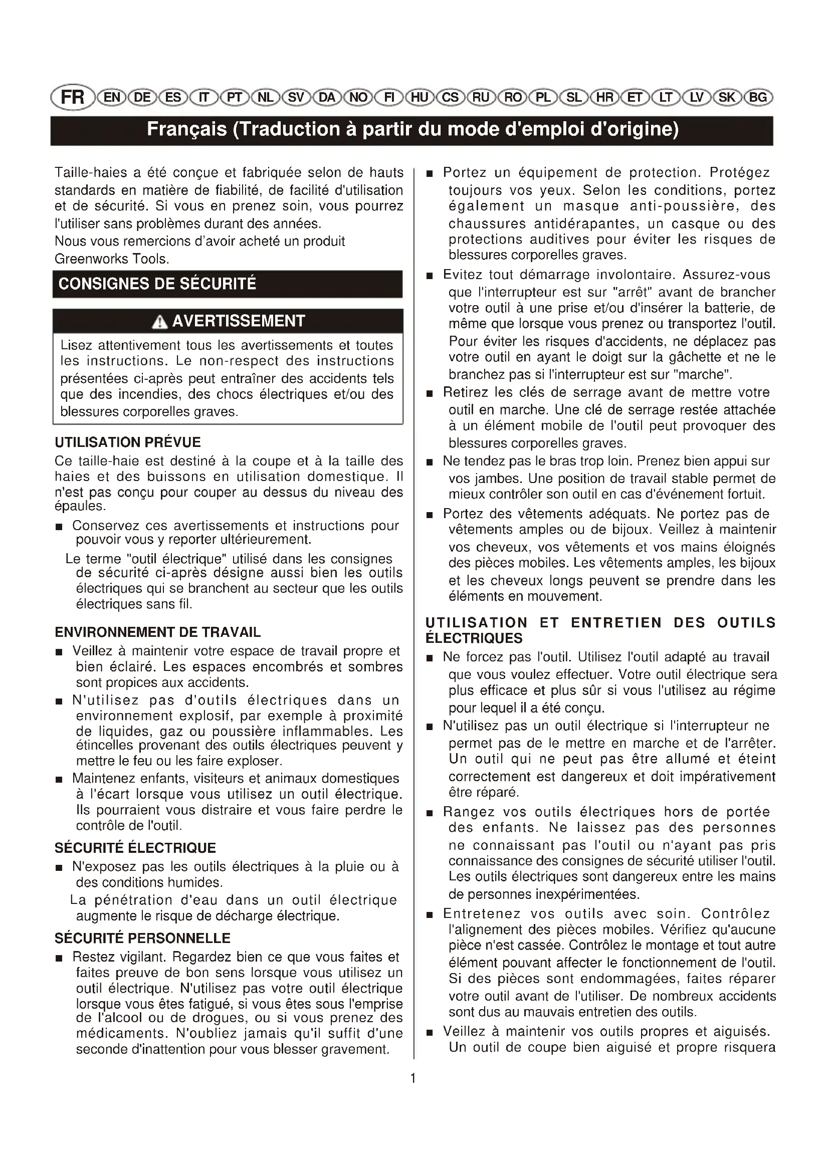 EN DE ES IT PT NL SV DA NO FI HU CS RU RO PL SL HR ET LT LV SK BG Taille-haies a été conçue et fabriquée selon de hauts standards en matière de fiabilité, de facilité d'utilisation et de sécurité. Si vous en prenez soin, vous pourrez l'utiliser sans problèmes durant des années. Nous vous remercions d’avoir acheté un produit Greenworks Tools.