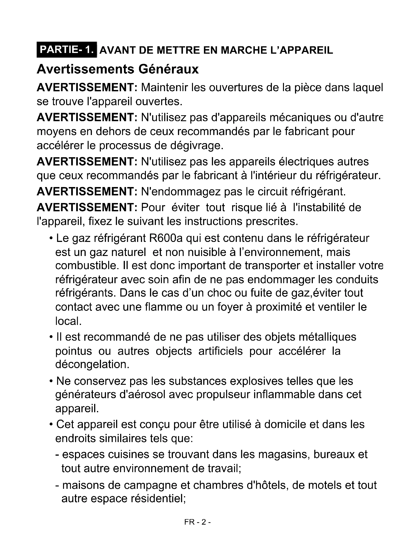 AVERTISSEMENT: N'utilisez pas d'appareils mécaniques ou d'autres moyens en dehors de ceux recommandés par le fabricant pour accélérer le processus de dégivrage.