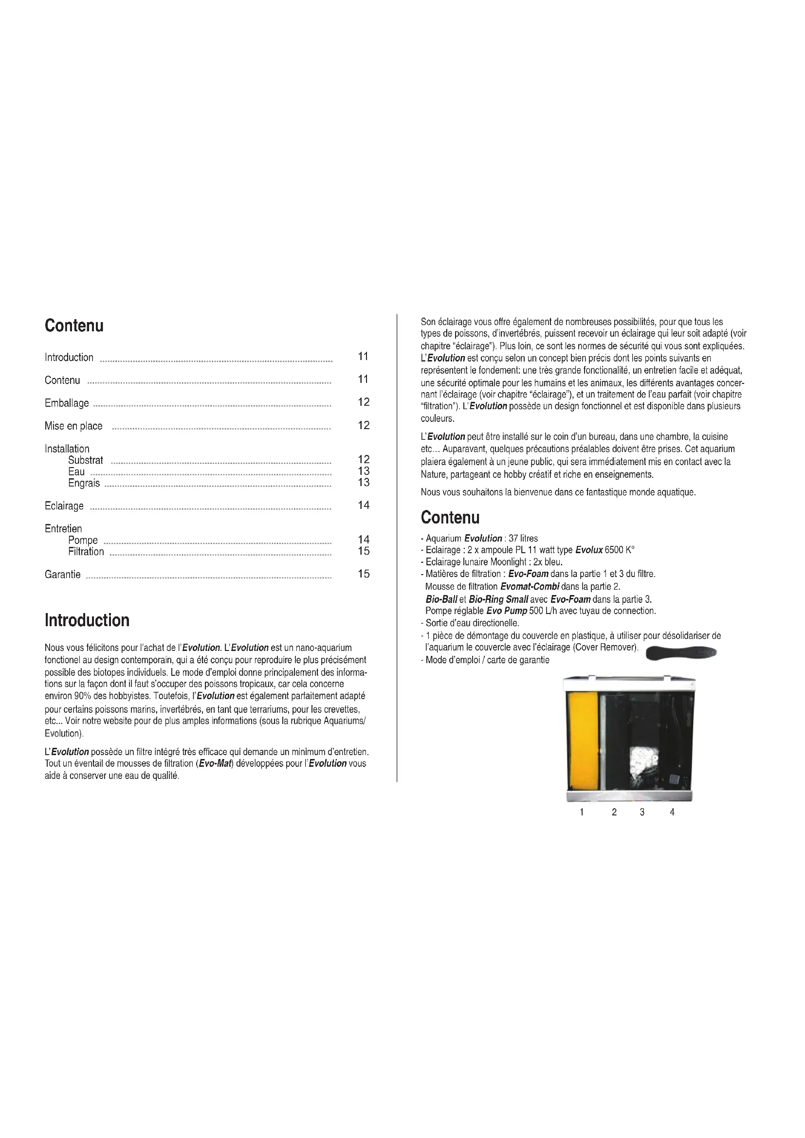 Nous vous félicitons pour l'achat de l'Evolution. L'Evolution est un nano-aquarium fonctionel au design contemporain, qui a été conçu pour reproduire le plus précisément possible des biotopes individuels. Le mode d'emploi donne principalement des informations sur la façon dont il faut s'occuper des poissons tropicaux, car cela concerne environ 90% des hobbyistes. Toutefois, l'Evolution est également parfaitement adapté pour certains poissons marins, invertébrés, en tant que terrariums, pour les crevettes, etc... Voir notre website pour de plus amples informations (sous la rubrique Aquariums/Evolution).