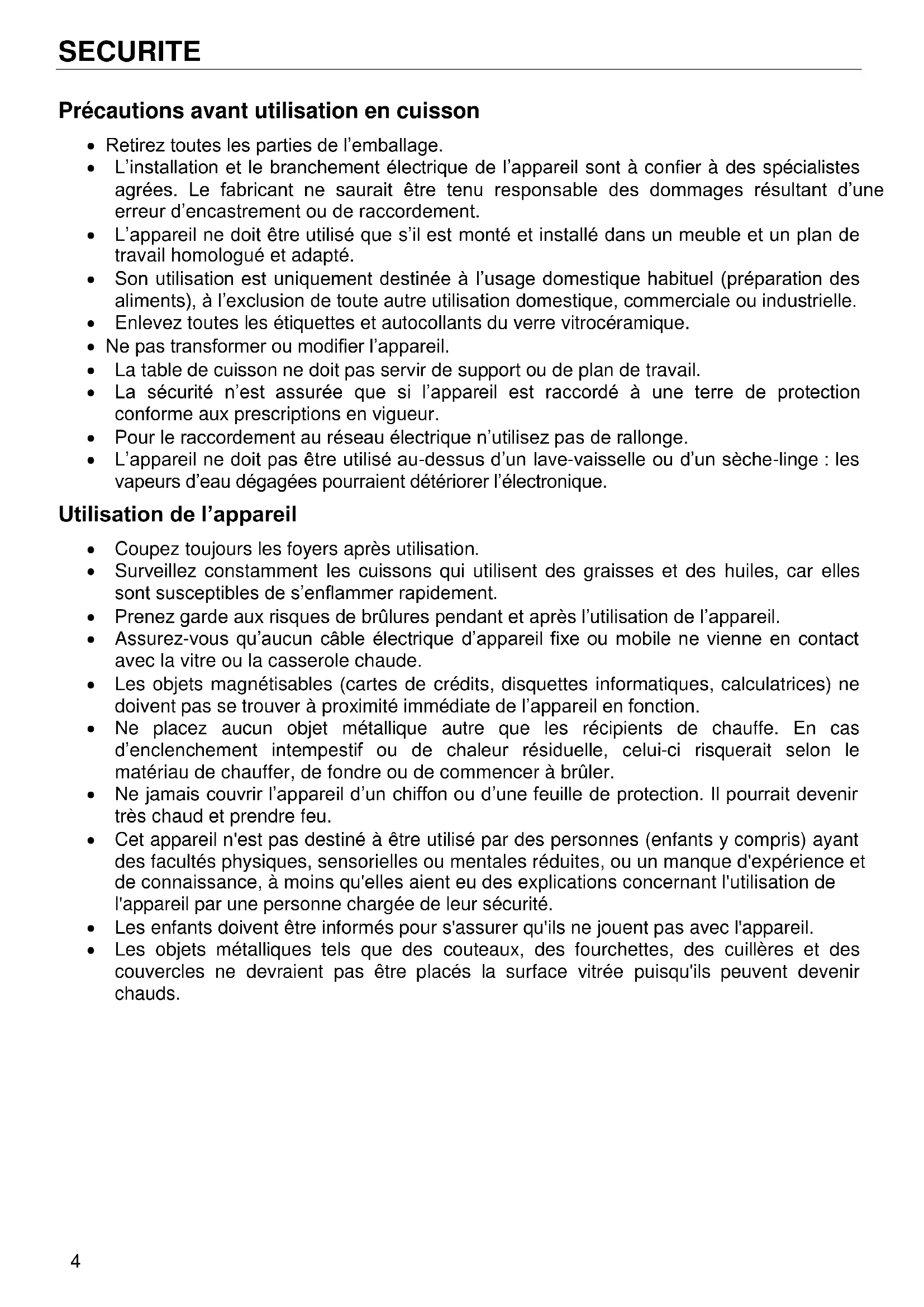 CONNEXION ELECTRIQUE .....................................................................................................15 GARANTIE ................................................................................................................................164 SECURITE Précautions avant utilisation en cuisson Retirez toutes les parties de l’emballage. L’installation et le branchement électrique de l’appareil sont à confier à des spécialistes agrées. Le fabricant ne saurait être tenu responsable des dommages résultant d’une erreur d’encastrement ou de raccordement. L’appareil ne doit être utilisé que s’il est monté et installé dans un meuble et un plan de travail homologué et adapté. Son utilisation est uniquement destinée à l’usage domestique habituel (préparation des aliments), à l’exclusion de toute autre utilisation domestique, commerciale ou industrielle. Enlevez toutes les étiquettes et autocollants du verre vitrocéramique. Ne pas transformer ou modifier l’appareil. La table de cuisson ne doit pas servir de support ou de plan de travail. La sécurité n’est assurée que si l’appareil est raccordé à une terre de protection conforme aux prescriptions en vigueur. Pour le raccordement au réseau électrique n’utilisez pas de rallonge. L’appareil ne doit pas être utilisé au-dessus d’un lave-vaisselle ou d’un sèche-linge : les vapeurs d’eau dégagées pourraient détériorer l’électronique. Utilisation de l’appareil Coupez toujours les foyers après utilisation. Surveillez constamment les cuissons qui utilisent des graisses et des huiles, car elles sont susceptibles de s’enflammer rapidement. Prenez garde aux risques de brûlures pendant et après l’utilisation de l’appareil. Assurez-vous qu’aucun câble électrique d’appareil fixe ou mobile ne vienne en contact avec la vitre ou la casserole chaude. Les objets magnétisables (cartes de crédits, disquettes informatiques, calculatrices) ne doivent pas se trouver à proximité immédiate de l’appareil en fonction. Ne placez aucun objet métallique autre que les récipients de chauffe. En cas d’enclenchement intempestif ou de chaleur résiduelle, celui-ci risquerait selon le matériau de chauffer, de fondre ou de commencer à brûler. Ne jamais couvrir l’appareil d’un chiffon ou d’une feuille de protection. Il pourrait devenir très chaud et prendre feu. Cet appareil n'est pas destiné à être utilisé par des personnes (enfants y compris) ayant des facultés physiques, sensorielles ou mentales réduites, ou un manque d'expérience et de connaissance, à moins qu'elles aient eu des explications concernant l'utilisation de l'appareil par une personne chargée de leur sécurité. Les enfants doivent être informés pour s'assurer qu'ils ne jouent pas avec l'appareil. Les objets métalliques tels que des couteaux, des fourchettes, des cuillères et des couvercles ne devraient pas être placés la surface vitrée puisqu'ils peuvent devenir chauds.5 Précautions pour ne pas détériorer l’appareil Les casseroles à semelles brutes (fonte non émaillée,…) ou abîmées peuvent endommager la vitrocéramique. La présence de sable ou d’autres matériaux abrasifs peut endommager la vitrocéramique. Evitez de faire chuter des objets, mêmes petits, sur la vitrocéramique. Ne heurtez pas les bords de la vitre avec les casseroles. S’assurer que la ventilation de l’appareil se fasse suivant les instructions du constructeur. Ne posez pas ou ne pas laisser de casseroles vides sur la table de cuisson. Eviter que le sucre, les matières synthétiques ou une feuille d’aluminium ne touchent les zones chaudes. Ces substances peuvent au refroidissement provoquer des cassures ou d’autres modifications de la surface vitrocéramique: Etendre l’appareil et enlevez-les immédiatement de la zone de cuisson encore chaude (attention : risque de brûlures). Ne placez jamais de récipients chauds au dessus de la zone de commande. Si un tiroir est situé sous l’appareil encastré, assurer un écart suffisant (2 cm) entre le contenu de ce tiroir et la partie inférieure de l’appareil afin d’assurer une bonne ventilation. Ne déposez pas d’objets inflammables (ex. sprays) dans le tiroir placé sous la table de cuisson. Les éventuels casiers à couverts doivent être en matériau résistant à la chaleur. Précautions en cas de défaillance de l’appareil Si un défaut est constaté, il faut déclencher l’appareil et couper le ligne d’alimentation électrique. En cas de fêlure ou de fissure de la vitrocéramique il faut impérativement débrancher l’appareil du réseau électrique et prévenir le service après-vente. Les réparations doivent être entreprises exclusivement par un personnel spécialisé. N’ouvrez en aucun cas l’appareil vous-même. ATTENTION : Si la surface vitrée est fissurée, coupez l’alimentation de l’appareil pour éviter une éventuelle décharge électrique. Autres protections Assurez-vous que le récipient de cuisson soit toujours centré sur la zone de cuisson. Le fond de la casserole doit autant que possible couvrir la zone de cuisson. Pour les utilisateurs portant un régulateur de rythme cardiaque, le champ magnétique pourrait influencer son fonctionnement. Nous recommandons de se renseigner auprès du revendeur ou du médecin. N’utilisez pas de récipients en matière synthétique ou en aluminium : ils pourraient fondre sur des foyers encore chauds.