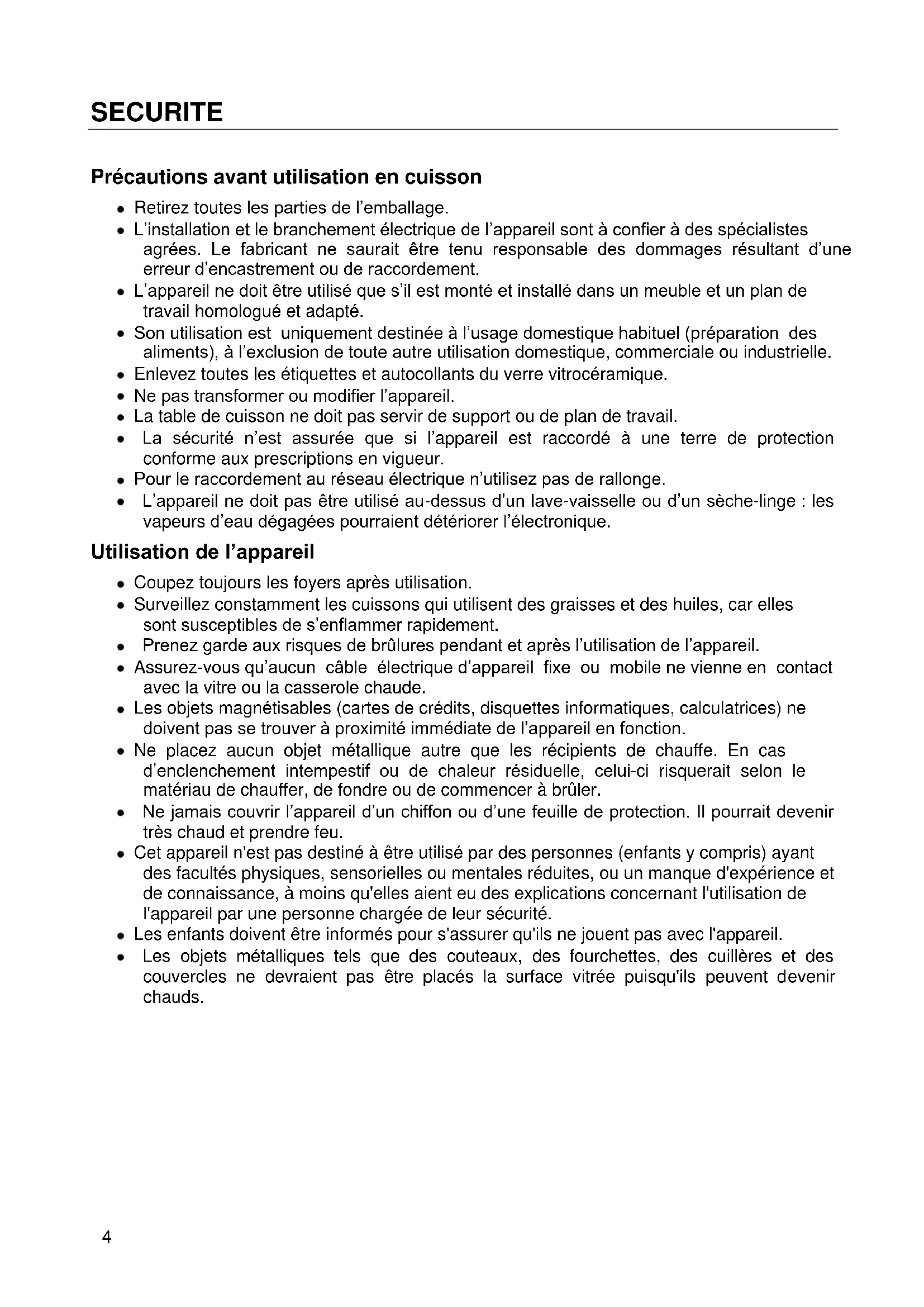 Notice d’utilisation2 Chère cliente, cher client, Nous vous remercions de la confiance que vous nous avez accordée en choisissant notre table de cuisson vitrocéramique à induction. Afin de bien connaître cet appareil, nous vous recommandons de lire attentivement cette notice d’utilisation dans son intégralité et de la conserver pour une consultation ultérieure.3 SOMMAIRE SECURITE ............................................................................................................ 4