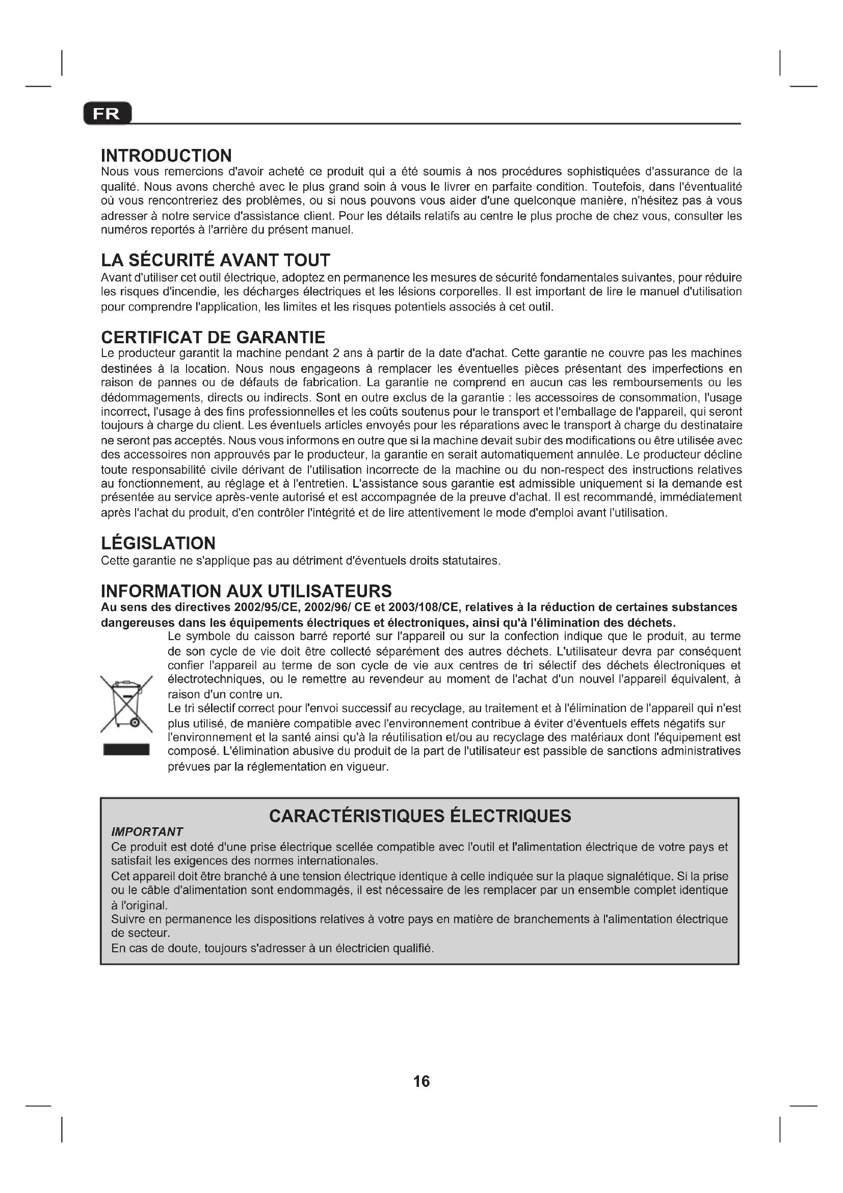 Leproducteurgarantitlamachinependant2ansàpartirdeladated'achat.Cettegarantienecouvrepaslesmachines destinées à la location. Nous nous engageons à remplacer les éventuelles pièces présentant des imperfections en raison de pannes ou de défauts de fabrication. La garantie ne comprend en aucun cas les remboursements ou les dédommagements, directs ou indirects. Sont en outre exclus de la garantie : les accessoires de consommation, l'usage incorrect,l'usageàdesfinsprofessionnellesetlescoûtssoutenuspourletransportetl'emballagedel'appareil,quiseront toujoursàchargeduclient.Leséventuelsarticlesenvoyéspourlesréparationsavecletransportàchargedudestinataire ne seront pas acceptés. Nous vous informons en outre que si la machine devait subir des modifications ou être utilisée avec des accessoires non approuvés par le producteur, la garantie en serait automatiquement annulée. Le producteur décline touteresponsabilitéciviledérivantdel'utilisationincorrectedelamachineoudunon-respectdesinstructionsrelatives aufonctionnement,auréglageetàl'entretien.L'assistancesousgarantieestadmissibleuniquementsilademandeest présentéeauserviceaprès-venteautoriséetestaccompagnéedelapreuved'achat.Ilestrecommandé,immédiatement aprèsl'achatduproduit,d'encontrôlerl'intégritéetdelireattentivementlemoded'emploiavantl'utilisation. LÉGISLATION Cette garantie ne s'applique pas au détriment d'éventuels droits statutaires.