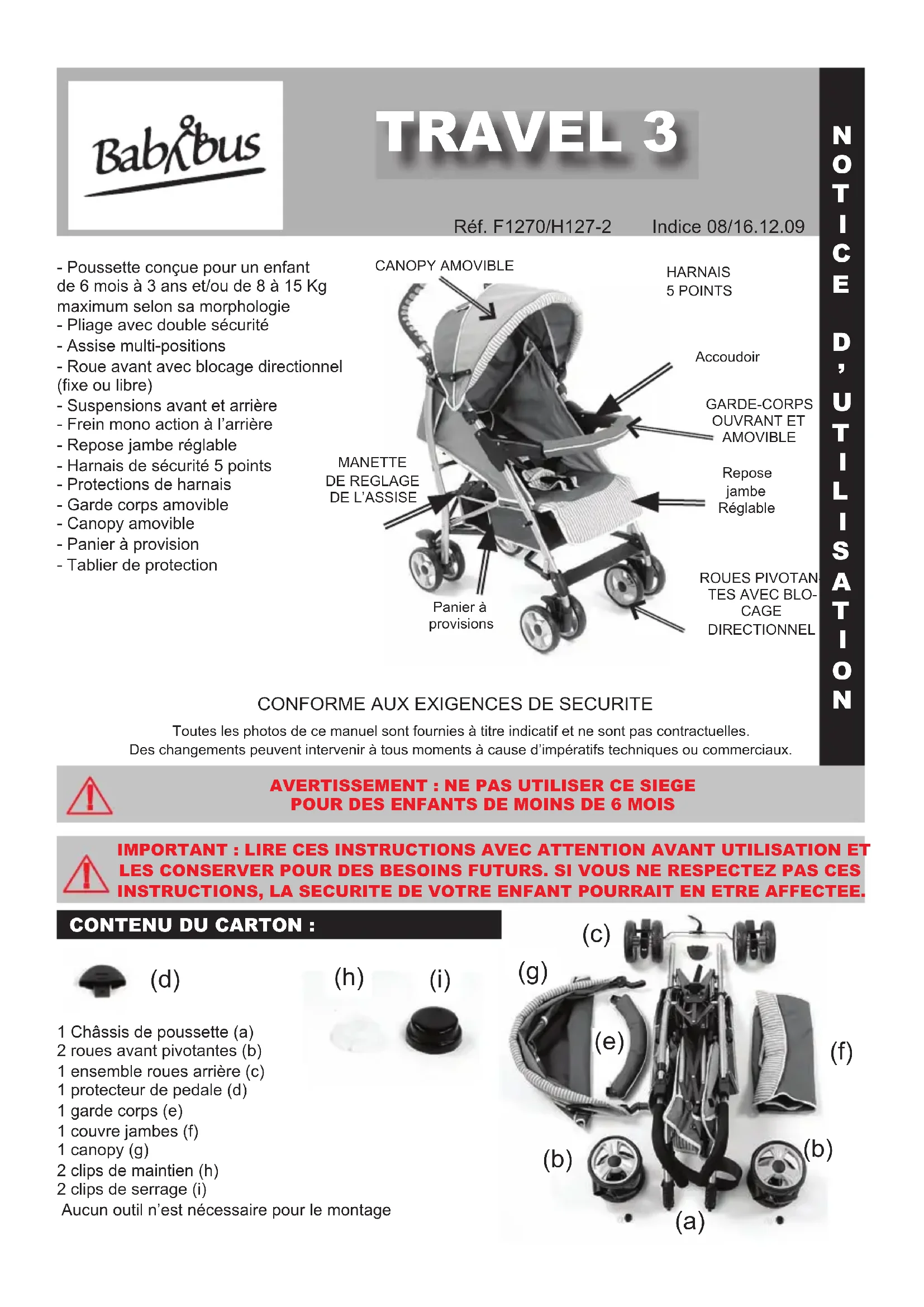 Indice 08/16.12.09 Réf. F1270/H127-2 1 Châssis de poussette (a) 2 roues avant pivotantes (b) 1 ensemble roues arrière (c) 1 protecteur de pedale (d) 1 garde corps (e) 1 couvre jambes (f) 1 canopy (g) 2 clips de maintien (h) 2 clips de serrage (i) Aucun outil n’est nécessaire pour le montage Toutes les photos de ce manuel sont fournies à titre indicatif et ne sont pas contractuelles.Des changements peuvent intervenir à tous moments à cause d’impératifs techniques ou commerciaux.ROUES PIVOTAN-TES AVEC BLO- CAGE