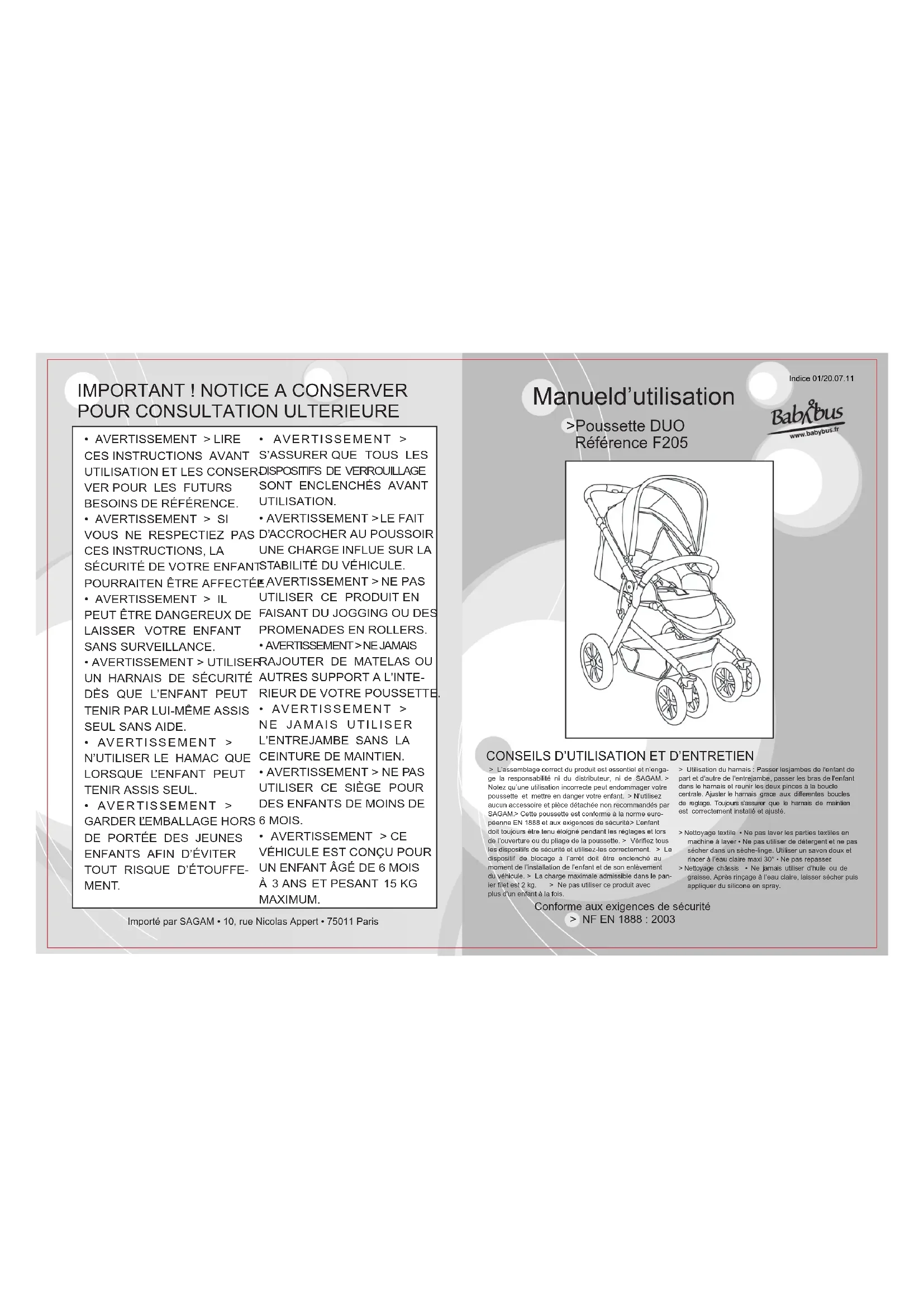 > L’assemblage correct du produit est essentiel et n’enga-ge la responsabilité ni du distributeur, ni de SAGAM. >Notez qu’une utilisation incorrecte peut endommager votrepoussette et mettre en danger votre enfant. > N’utilisezaucun accessoire et pièce détachée non recommandés parSAGAM. > Cette poussette est conforme à la norme euro-péenne EN 1888 et aux exigences de sécurité. > L’enfantdoit toujours être tenu éloigné pendant les réglages et lorsde l’ouverture ou du pliage de la poussette. > Vérifiez tousles dispositifs de sécurité et utilisez-les correctement. > Ledispositif de blocage à l’arrêt doit être enclenché aumoment de l’installation de l’enfant et de son enlèvementdu véhicule. > La charge maximale admissible dans le pan-ier filet est 2 kg. > Ne pas utiliser ce produit avec plus d'un enfant à la fois.> Utilisation du harnais : Passer lesjambes de l'enfant de part et d'autre de l'entrejambe, passer les bras de l'enfant dans le harnais et reunir les deux pinces à la boucle centrale. Ajuster le harnais grace aux differentes boucles de reglage. Toujours s'assurer que le harnais de maintien est correctement installé et ajusté.> Nettoyage textile • Ne pas laver les parties textiles enmachine à laver • Ne pas utiliser de détergent et ne passécher dans un sèche-linge. Utiliser un savon doux etrincer à l’eau claire maxi 30° • Ne pas repasser. > Nettoyage châssis • Ne jamais utiliser d’huile ou de graisse. Après rinçage à l’eau claire, laisser sécher puisappliquer du silicone en spray.Indice 01/20.07.111