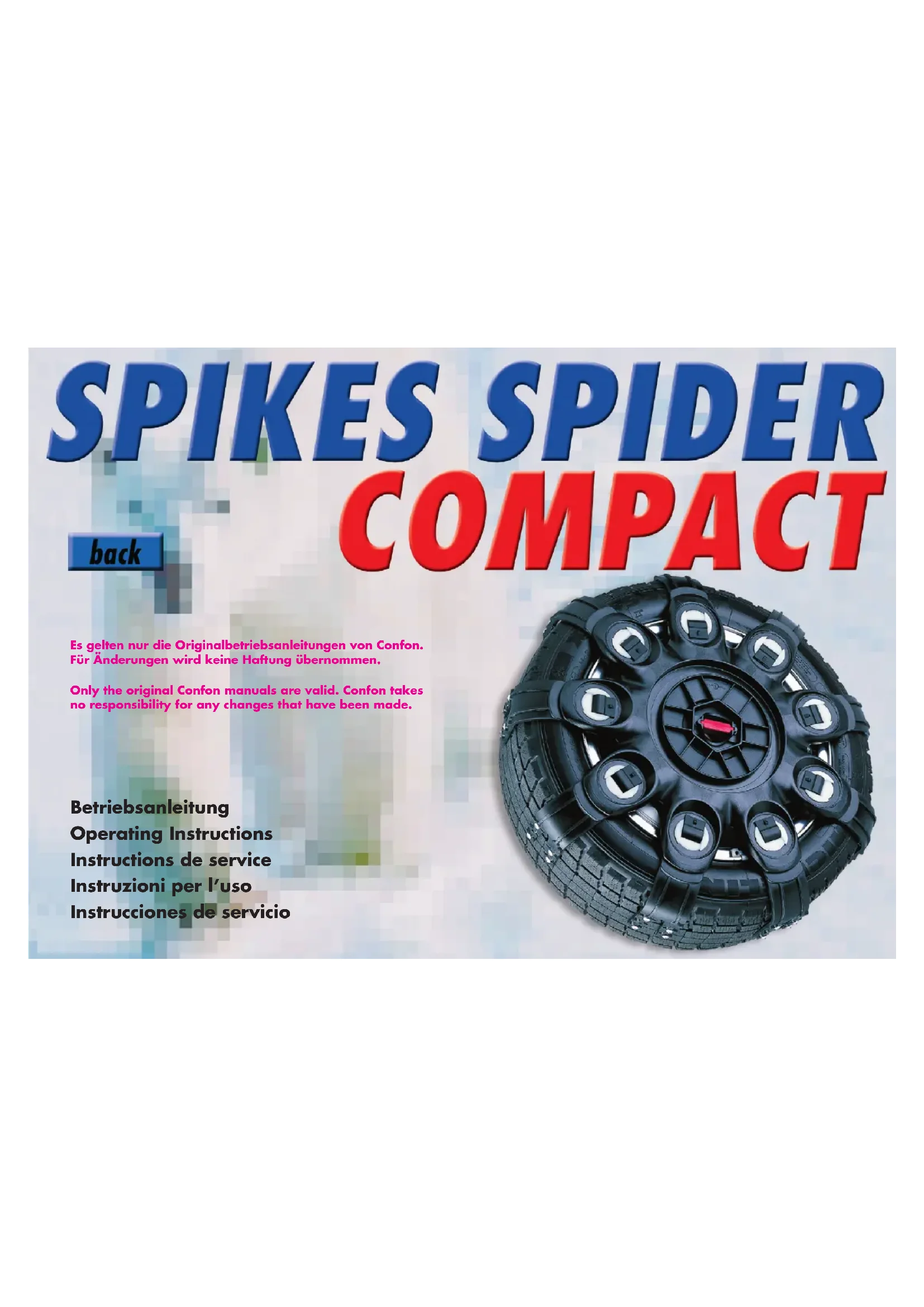 Garantie. La condition fondamentale de toute pretention de garantie est le respect des instructions de montage d'emploi. Madame, Monsieur. Nous vous remercions de la confiance, que vous nous avez temoignee en achetant notre produit SPIKES-SPIDER COMPACT. Vous avez aquis avec ce SPIKES-SPIDER COMPACT un produit de haute qualite, qui vous offre une conduite sure et sans problemes en hiver, sur la neige et la glace. Nous avons fabriqué le SPIKES-SPIDER COMPACT avec le plus grand soin, en utilisant des matieres premières de la(Meilleure qualite. Eu egard à la qualite de ces matieres premières et à la fabrication sans défauts du produit SPIKES-SPIDER COMPACT, nous vous accordons 2 années de garantie, à partir de la date de l'achat.