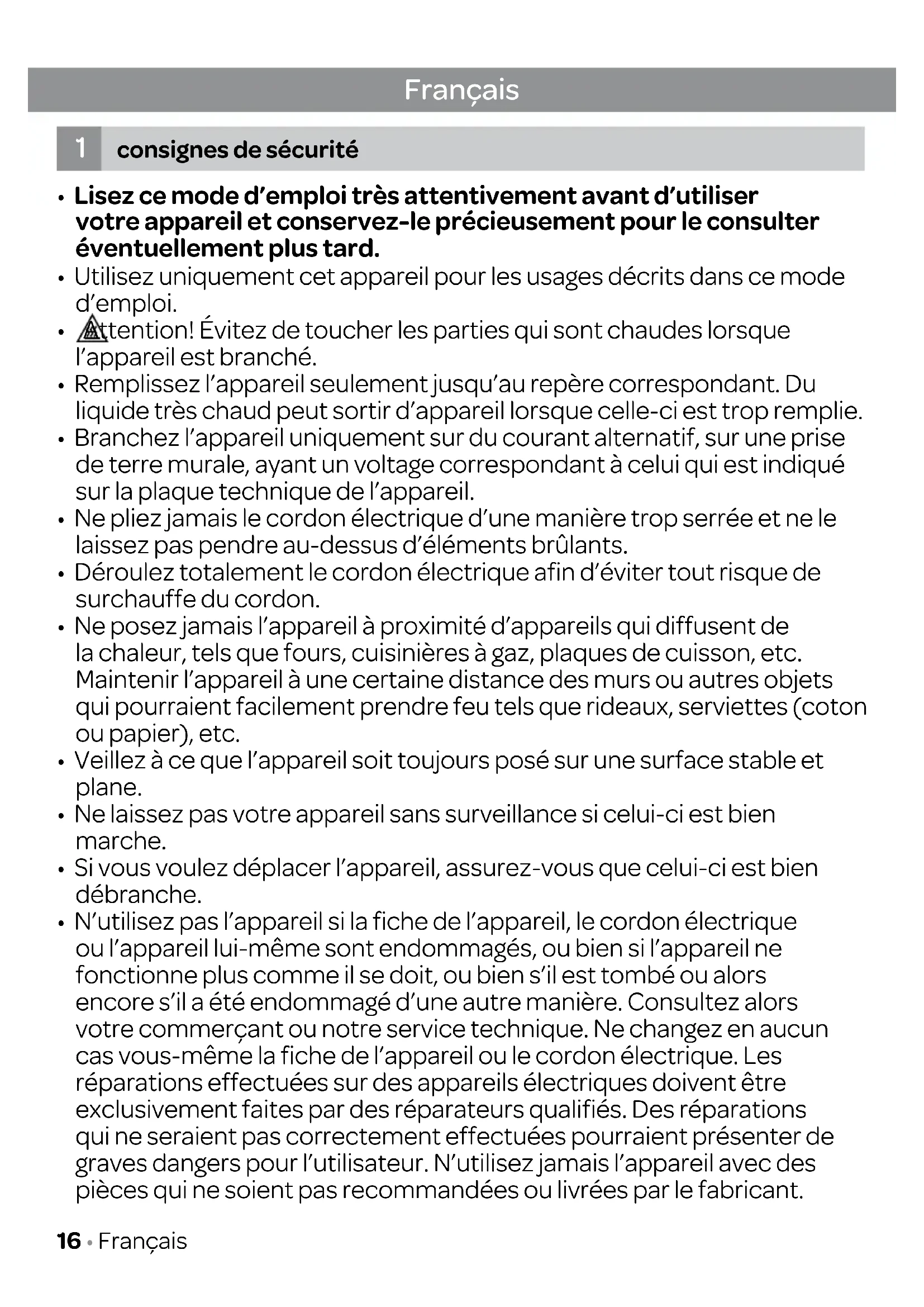 - N’utilisez pas l’appareil si la fiche de l’appareil, le cordon électrique ou l’appareil lui-même sont endommagés, ou bien si l’appareil ne fonctionne plus comme il se doit, ou bien s’il est tombé ou alors encore s’il a été endommagé d’une autre manière. Consultez alors votre commerçant ou notre service technique. Ne changez en aucun cas vous-même la fiche de l’appareil ou le cordon électrique. Les réparations effectuées sur des appareils électriques doivent être exclusivement faites par des réparateurs qualifiés. Des réparations qui ne seraient pas correctement effectuées pourraient présenter de graves dangers pour l’utilisateur. N’utilisez jamais l’appareil avec des pièces qui ne soient pas recommandées ou livrées par le fabricant. Français consignes de sécurité
