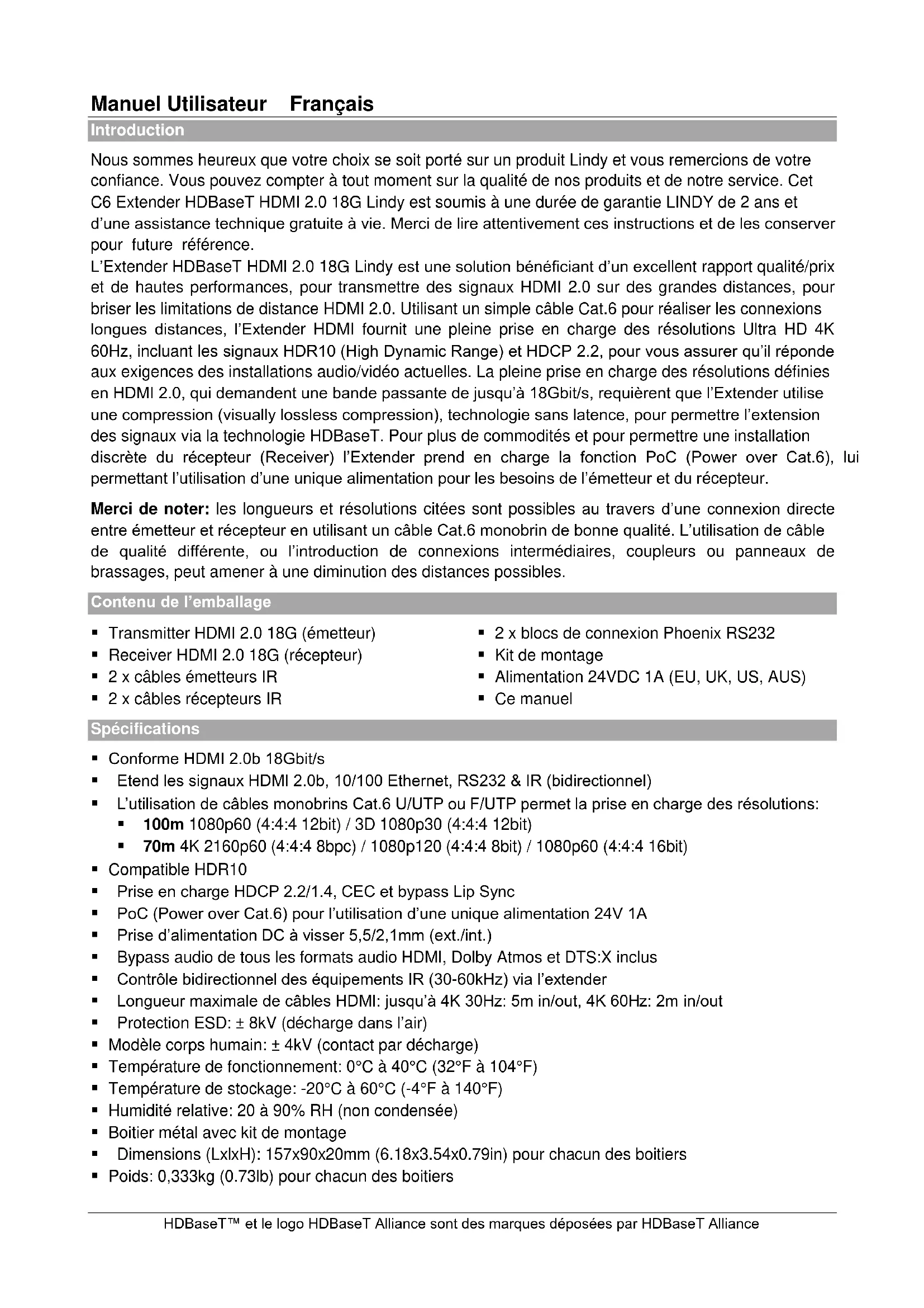 beenden. Zusätzlich zur Basisinstallation können weitere Funktionen genutzt werden: 10/100 Ethernet Sowohl der Transmitter als auch der Receiver besitzen einen RJ45 Port für die Verbindung von Netzwerkzubehör wie Router, eines Netzwerkswitches, einer IP-Kamera, Wireless Access Points oder Smart TVs. RS-232 Seriell Sowohl Transmitter als auch Receiver verfügen über einen seriellen Anschluss um entsprechende Signale zu übertragen. Infrarot-Kontrolle Sowohl Transmitter als auch Receiver verfügen über einen IR IN und IR OUT Port (Kabel befinden sich im Lieferumfang). Dies ermöglicht die bidirektionale Nutzung und Übertragung von IR Signalen. Fehlersuche Kein Bild: Falls Sie Probleme bei der Übertragung von Signalen haben, führen Sie bitte folgende Schritte durch: Versuchen Sie einen anderen Eingangsport Ihres HDTVs Reduzieren Sie die Kabellänge am Eingang und Ausgang auf 1m Versuchen Sie einen anderen Kabeltyp (1m Länge) Überprüfen Sie die Verbindung des Netzteils. Achten Sie darauf, dass die LED des Transmitters und des Receivers leuchtet. Überprüfen Sie die Verbindung des Cat.6/7 Kabels. Achten Sie darauf, dass die grüne LED sowohl am HDBaseT OUT als auch am HDBaseT IN Port leuchtet. Überprüfen Sie ebenfalls die gelbe Status LED beider Ports. Falls diese nicht blinkt, schalten Sie bitte beide Geräte aus und wieder ein. Bei einigen Geräten ist es hilfreich die HDMI-Verbindungen erneut herzustellen um einen erneuten “Hand-Shake” herbeizuführen. Schalten Sie alle Geräte aus und in folgender Reihenfolge wieder ein: Extender, Display, Quelle. Reduzieren Sie die Kabellänge des Cat.6/7 oder HDMI Kabels oder versuchen Sie es erneut mit hochwertigeren Kabeln.Manuel Utilisateur Français HDBaseT™ et le logo HDBaseT Alliance sont des marques déposées par HDBaseT Alliance Introduction Nous sommes heureux que votre choix se soit porté sur un produit Lindy et vous remercions de votre confiance. Vous pouvez compter à tout moment sur la qualité de nos produits et de notre service. Cet C6 Extender HDBaseT HDMI 2.0 18G Lindy est soumis à une durée de garantie LINDY de 2 ans et d’une assistance technique gratuite à vie. Merci de lire attentivement ces instructions et de les conserver pour future référence. L’Extender HDBaseT HDMI 2.0 18G Lindy est une solution bénéficiant d’un excellent rapport qualité/prix et de hautes performances, pour transmettre des signaux HDMI 2.0 sur des grandes distances, pour briser les limitations de distance HDMI 2.0. Utilisant un simple câble Cat.6 pour réaliser les connexions longues distances, l’Extender HDMI fournit une pleine prise en charge des résolutions Ultra HD 4K 60Hz, incluant les signaux HDR10 (High Dynamic Range) et HDCP 2.2, pour vous assurer qu’il réponde aux exigences des installations audio/vidéo actuelles. La pleine prise en charge des résolutions définies en HDMI 2.0, qui demandent une bande passante de jusqu’à 18Gbit/s, requièrent que l’Extender utilise une compression (visually lossless compression), technologie sans latence, pour permettre l’extension des signaux via la technologie HDBaseT. Pour plus de commodités et pour permettre une installation discrète du récepteur (Receiver) l’Extender prend en charge la fonction PoC (Power over Cat.6), lui permettant l’utilisation d’une unique alimentation pour les besoins de l’émetteur et du récepteur. Merci de noter: les longueurs et résolutions citées sont possibles au travers d’une connexion directe entre émetteur et récepteur en utilisant un câble Cat.6 monobrin de bonne qualité. L’utilisation de câble de qualité différente, ou l’introduction de connexions intermédiaires, coupleurs ou panneaux de brassages, peut amener à une diminution des distances possibles. Contenu de l’emballage Transmitter HDMI 2.0 18G (émetteur) Receiver HDMI 2.0 18G (récepteur) 2 x câbles émetteurs IR 2 x câbles récepteurs IR 2 x blocs de connexion Phoenix RS232 Kit de montage Alimentation 24VDC 1A (EU, UK, US, AUS) Ce manuel Spécifications Conforme HDMI 2.0b 18Gbit/s Etend les signaux HDMI 2.0b, 10/100 Ethernet, RS232 & IR (bidirectionnel) L’utilisation de câbles monobrins Cat.6 U/UTP ou F/UTP permet la prise en charge des résolutions: 100m 1080p60 (4:4:4 12bit) / 3D 1080p30 (4:4:4 12bit) 70m 4K 2160p60 (4:4:4 8bpc) / 1080p120 (4:4:4 8bit) / 1080p60 (4:4:4 16bit) Compatible HDR10 Prise en charge HDCP 2.2/1.4, CEC et bypass Lip Sync PoC (Power over Cat.6) pour l’utilisation d’une unique alimentation 24V 1A Prise d’alimentation DC à visser 5,5/2,1mm (ext./int.) Bypass audio de tous les formats audio HDMI, Dolby Atmos et DTS:X inclus Contrôle bidirectionnel des équipements IR (30-60kHz) via l’extender Longueur maximale de câbles HDMI: jusqu’à 4K 30Hz: 5m in/out, 4K 60Hz: 2m in/out Protection ESD: ± 8kV (décharge dans l’air) Modèle corps humain: ± 4kV (contact par décharge) Température de fonctionnement: 0°C à 40°C (32°F à 104°F) Température de stockage: -20°C à 60°C (-4°F à 140°F) Humidité relative: 20 à 90% RH (non condensée) Boitier métal avec kit de montage Dimensions (LxlxH): 157x90x20mm (6.18x3.54x0.79in) pour chacun des boitiers Poids: 0,333kg (0.73lb) pour chacun des boitiersManuel Utilisateur Français Vue d’ensemble Transmitter – Vues avant et arrière