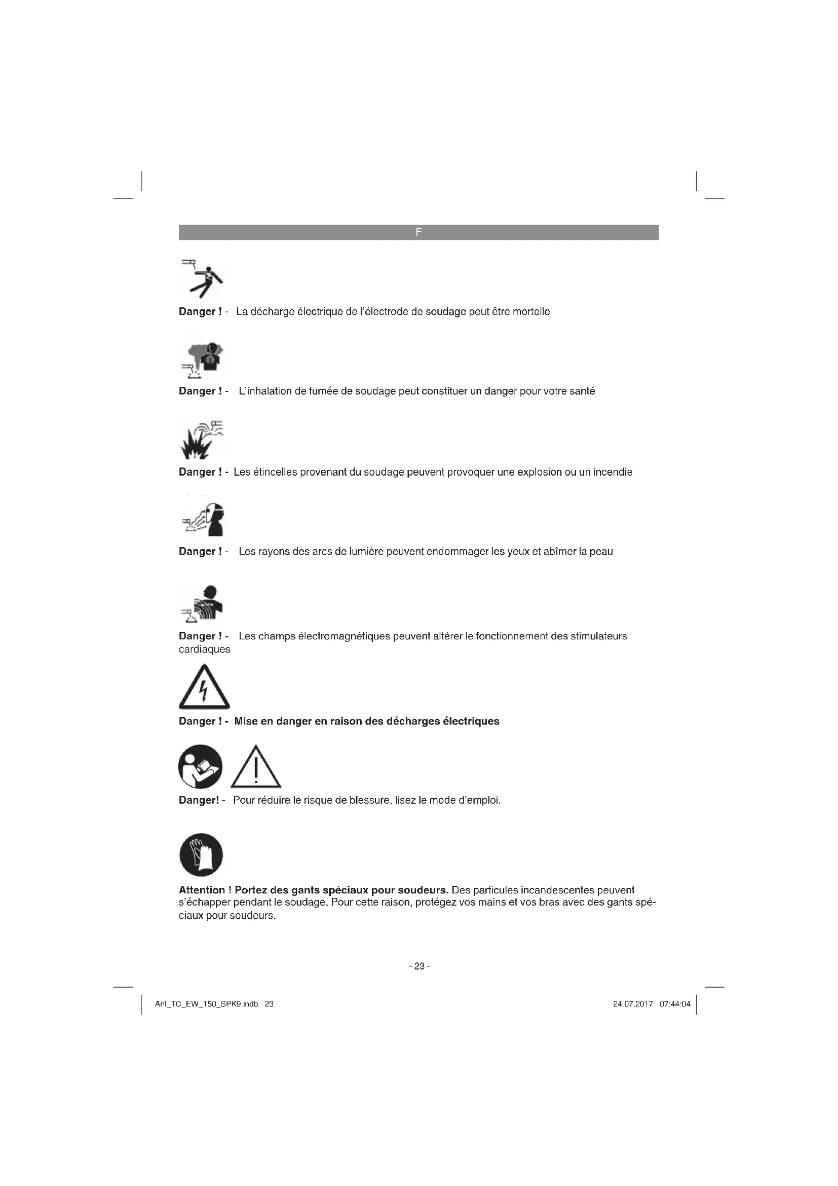 Danger ! - La décharge électrique de l’électrode de soudage peut être mortelle Danger ! - L’inhalation de fumée de soudage peut constituer un danger pour votre santé Danger ! - Les rayons des arcs de lumière peuvent endommager les yeux et abîmer la peau Danger ! - Les étincelles provenant du soudage peuvent provoquer une explosion ou un incendie Danger ! - Les champs électromagnétiques peuvent altérer le fonctionnement des stimulateurs cardiaques Danger ! - Mise en danger en raison des décharges électriques Danger! - Pour réduire le risque de blessure, lisez le mode d’emploi. Attention ! Portez des gants spéciaux pour soudeurs. Des particules incandescentes peuvent s’échapper pendant le soudage. Pour cette raison, protégez vos mains et vos bras avec des gants spé- ciaux pour soudeurs. Anl_TC_EW_150_SPK9.indb 23Anl_TC_EW_150_SPK9.indb 23 24.07.2017 07:44:0424.07.2017 07:44:04F