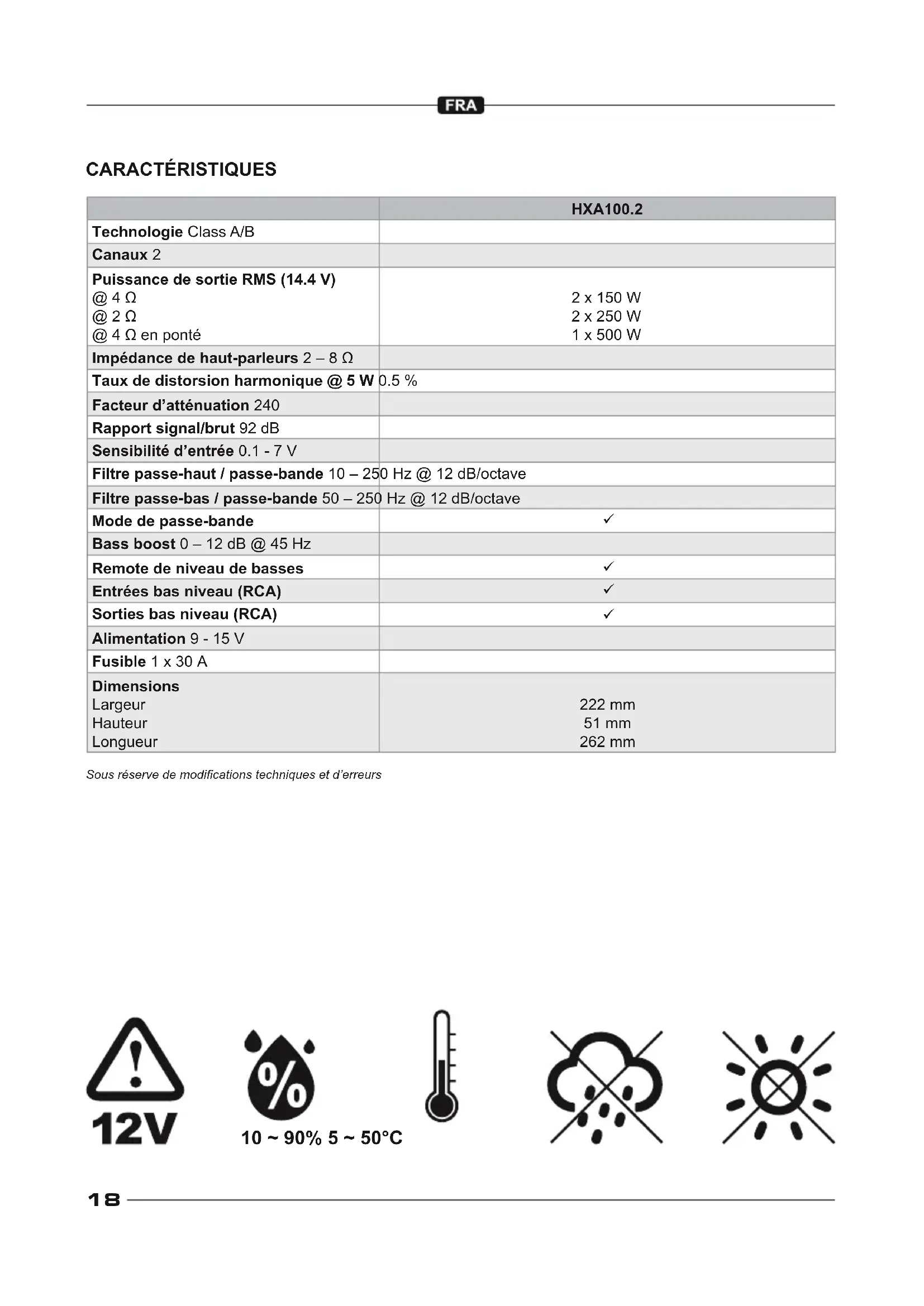 Vériez les étapes suivantes: Le contrôleur de niveau d’entrée de l’appareil est-il réglé trop haut? Baissez lentement le contrôleur jusqu’à ce que vous entendiez un signal audio clair. L’amplication des basses de l’appareil est-elle trop élevée? Baissez lentement le contrôleur jusqu’à ce que vous entendiez un signal audio clair. La fonction Loudness de l’autoradio est-elle réglée trop haut? Désactivez le Loudness ou baissez le paramètre Loudness jusqu’à ce que vous entendiez un signal audio clair. Les paramètres d’égalisation et de son de l’autoradio sont-ils trop élevés? Baissez les paramètres Treble, Mid et Bass ou désactivez l’égaliseur jusqu’à ce que vous entendiez un signal audio clair. BRUITS AUDIBLES (EN FONCTION DU RÉGIME MOTEUR) Vériez les étapes suivantes: Les câbles RCA ont-ils été posés séparément du câble d’alimentation dans le véhicule? Si nécessaire, réacheminez les câbles et assurez-vous que les câbles RCA sont posés séparément du câble d’alimentation à gauche et à droite du véhicule. La connexion à la masse de l’appareil est-elle correctement connectée ? Assurez-vous que la connexion à la masse de l’appareil n’est pas connectée directement à la borne négative de la batterie du véhicule. Sélectionnez un point de masse approprié sur la carrosserie du véhicule à connecter. Si nécessaire, utilisez un spray contact pour améliorer la conductivité des connexions. La conductivité du câble de masse de la batterie du véhicule vers la carrosserie est-elle correcte ? Assurez-vous que la connexion à la masse de la batterie du vçéhicule est stable et conductrice avec la carrosserie. Si nécessaire, utilisez un spray contact pour améliorer la conductivité des connexions.25 DATI TECNICI 10 ~ 90% 5 ~ 50°C HXA100.2 Tecnologia Class A/B Canali 2 Potenza di uscita (14.4 V) @ 4 Ω @ 2 Ω @ 4 Ω a ponte 2 x 150 W 2 x 250 W 1 x 500 W Impedenza altoparlanti 2 – 8 Ω Distorsione armonica totale @ 5 W 0.5 % Fattore di smorzamento 240 Rapporto segnale/rumore 92 dB Sensibilità di ingresso 0.1 - 7 V Filtro passa alto / passa banda 10 – 250 Hz @ 12 dB/ottava Filtro passa basso / passa banda 50 – 250 Hz @ 12 dB/ottava Modalità di passa banda