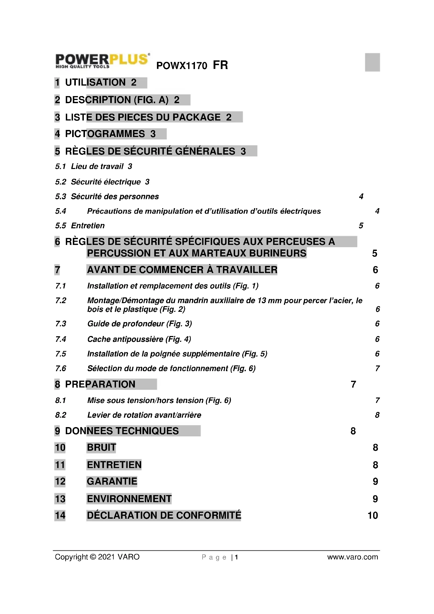 VARO N.V. - Vic. Van Rompuy N.V.- Joseph Van Instraat 9 - BE2500 Lier - BELGIQUE, déclare que : Appareil : Marteau perforateur 750 W Marque : PowerPlus Modèle : POWX1170 est en conformité avec les exigences essentielles et les autres dispositions pertinentes des Directives européennes applicables, basées sur l'application des normes européennes harmonisées. Toute modification non autorisée de l'appareil annule cette déclaration. Directives européennes (y compris, le cas échéant, leurs amendements à la date de la signature) : 2006/42/CE 2014/30/EU 2011/65/EU Normes européennes harmonisées (y compris, le cas échéant, leurs amendements à la date de la signature) : EN60745-1 : 2009 EN60745-2-6 : 2010 EN55014-1 : 2017 EN55014-2 : 2015 EN61000-3-2 : 2014 EN61000-3-3 : 2013 Détenteur de la Documentation technique : Philippe Vankerkhove, VARO – Vic. Van Rompuy N.V. Le soussigné agit au nom du PDG de l'entreprise, Philippe Vankerkhove Réglementation – Directeur de la conformité 09/10/2020, Lier - BelgiumPOWX1170 EN Copyright © 2021 VARO P a g e | 1 www.varo.com 1 APLICATION .................................................................................... 2